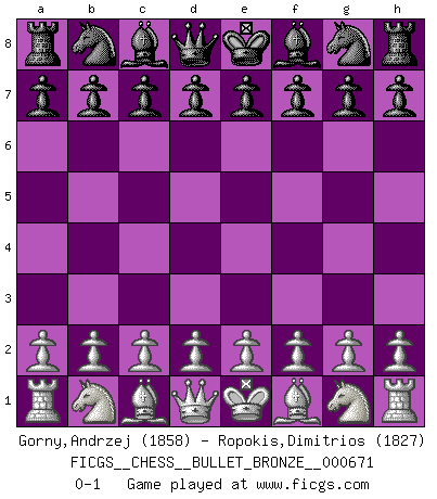 Last move : 0-1 2012 January 8 17:40:39 [Event "FICGS__CHESS__BULLET_BRONZE__000671"] [Site "FICGS"] [Date "2012.01.08"] [Round "1"] [White "Gorny,Andrzej"] [Black "Ropokis,Dimitrios"] [Result "0-1"] [WhiteElo "1858"] [BlackElo "1827"] 0-1 This chess game has been lost on time (started : 2012.01.08 16:0:4) Player Black won this chess game. Follow this game move after move (download)One bad move nullifies forty good ones. (Horowitz) Frage des Reporters: -Welche besonderen Umstände rechtfertigen das Anhalten der Uhren während einer Turnierpartie? Antwort: -Einen Fotographen zu strangulieren. (Siegbert Tarrasch) El Ajedrez es en su esencia, un juego. En su forma, un arte. Y en su ejecución, una ciencia. (Baron Tassilo) Les échecs, c'est la lutte contre l'erreur. (Johannes Zukertort) I couldn't make any sense out of what this particular thread is about. It sounds like R2 D2 computer speaking. A space fight ?!? Some 'command' problems in Moscow ? Some killers & narcotic addicts attacking some game & a god wannabe ?? (Dinesh De Silva, lost in a russian conflict in FICGS forum)