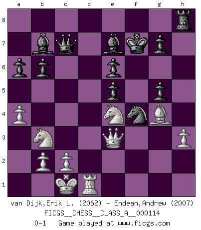 Last move : 0-1 2012 November 1 10:5:5 [Event "FICGS__CHESS__CLASS_A__000114"] [Site "FICGS"] [Date "2012.01.09"] [Round "1"] [White "van Dijk,Erik L."] [Black "Endean,Andrew"] [Result "0-1"] [WhiteElo "2062"] [BlackElo "2007"] 1.e4 c5 2.Nf3 d6 3.d4 cxd4 4.Nxd4 Nf6 5.Nc3 a6 6.Bg5 e6 7.f4 Qb6 8.Nb3 Be7 9.Qf3 Nbd7 10.O-O-O Qc7 11.g4 h6 12.Bxf6 Bxf6 13.e5 dxe5 14.f5 Nb6 15.Ne4 Nd5 16.fxe6 fxe6 17.g5 hxg5 18.Bh3 Be7 19.Bg4 Nf4 20.Qe3 b6 21.h3 Bb7 22.Rhe1 Rd8 23.Rxd8+ Kxd8 24.a4 Ke8 25.Rd1 Kf7 0-1 This chess game has been lost on time (started : 2012.01.09 17:18:15) Sicilian : Najdorf, 7...Qb6 Queenside Castling by player White (move 10) Player Black won this chess game. Follow this game move after move (download)Nowadays, when you're not a grandmaster at 14, you can forget about it. (Anand Viswanathan) Man kann eine Schachpartie nur gewinnen, wenn das Gleichgewicht gestört ist. In einer Stellung mit ungestörtem Gleichgewicht ist auch das größte Genie hilflos - in der Stellung steckt dann eben kein genialer Einfall. (Wilhelm Steinitz) Aquel que toma al Peón de Caballo de la Reina, se pasará la noche a dormir en la calle. (Anónimo) Toutes choses étant égales, c'est la conviction qui gagne. Alliée à une volonté de vaincre, elle sert de détonateur, suscite des idées, disperse les doutes et aide à penser clairement. (Robert Fischer) Are you threatening me, Master Jedi ? (Chancellor Palpatine in Star Wars ep.3)