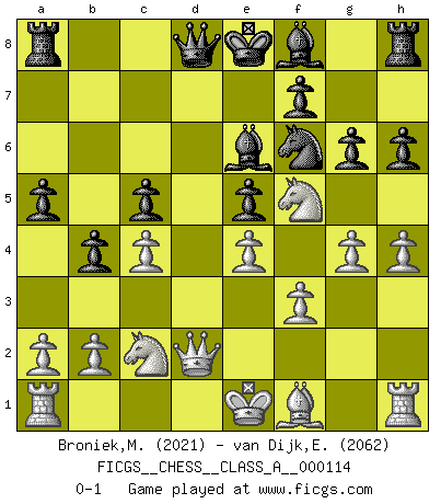 Last move : 0-1 2012 May 28 14:30:40 [Event "FICGS__CHESS__CLASS_A__000114"] [Site "FICGS"] [Date "2012.01.09"] [Round "1"] [White "Broniek,Mariusz Maciej"] [Black "van Dijk,Erik L."] [Result "0-1"] [WhiteElo "2021"] [BlackElo "2062"] 1.e4 c5 2.Nf3 d6 3.d4 cxd4 4.Nxd4 Nf6 5.Nc3 a6 6.Be3 e6 7.f3 b5 8.g4 b4 9.Nce2 h6 10.c4 e5 11.Nc2 a5 12.Ng3 Be6 13.Qd2 Nbd7 14.Nf5 Nc5 15.h4 g6 16.Bxc5 dxc5 0-1 Sicilian : Najdorf, Byrne (English) attack Player Black won this chess game. Follow this game move after move (download)In order to improve your game, you must study the endgame before everything else, for whereas the endings can be studied and mastered by themselves, the middle game and the opening must be studied in relation to the endgame. (Jose Raul Capablanca) Ich möchte Schüler heranbilden, die das Vermögen haben, selbst zu denken und Kritik zu üben. (Emanuel Lasker) Repentinamente, me resultaba obvio en mi analisis que yo había pasado por alto lo que Fischer había visto en el tablero con la mas grande facilidad. (Mikhail Botvinnik) Je ne crois pas en la psychologie, je crois aux bons coups. (Robert Fischer) Locking firmely the window serves nothing, only small thiefs pass through there, the big thiefs enter through the front door. (Luc-Olivier Leclerc)