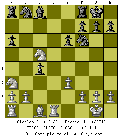 Last move : 1-0 2012 May 27 14:20:46 [Event "FICGS__CHESS__CLASS_A__000114"] [Site "FICGS"] [Date "2012.01.09"] [Round "1"] [White "Staples,Daniel"] [Black "Broniek,Mariusz Maciej"] [Result "1-0"] [WhiteElo "1912"] [BlackElo "2021"] 1.d4 d5 2.c4 dxc4 3.Nf3 Nf6 4.e3 e6 5.Bxc4 c5 6.O-O a6 7.dxc5 Qxd1 8.Rxd1 Bxc5 9.Nfd2 O-O 10.Nb3 b5 11.Nxc5 bxc4 12.Na3 1-0 QGA : Classical, 6...a6 Kingside Castling by player White (move 6) Kingside Castling by player Black (move 9) Player White won this chess game. Follow this game move after move (download)Of all my Russian books, the defense contains and diffuses the greatest 'warmth' which may seem odd seeing how supremely abstract Chess is supposed to be. (Vladimir Nabokov) Schach ist Krieg, im Schach geht es um testosterongesteuerte Urschreie. (Garry Kasparov) Hay dos clases de hombres: aquellos que se conforman en dejarse llevar por las circunstancias y que juegan barajas y aquellos decididos a controlar las circunstancias y que juegan al Ajedrez. (Mortimer Collins) Soyez une menace à chaque fois que vous vous asseyez pour jouer. (Ken Smith) Cactus - It is depressed cucumber. (Ilmars Cirulis)