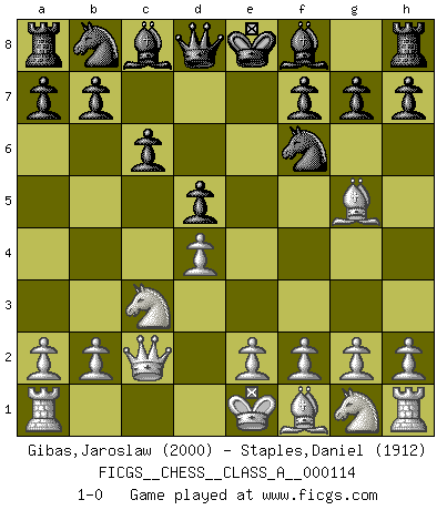 Last move : 1-0 2012 February 19 6:56:20 [Event "FICGS__CHESS__CLASS_A__000114"] [Site "FICGS"] [Date "2012.01.09"] [Round "1"] [White "Gibas,Jaroslaw"] [Black "Staples,Daniel"] [Result "1-0"] [WhiteElo "2000"] [BlackElo "1912"] 1.d4 Nf6 2.c4 e6 3.Nc3 d5 4.cxd5 exd5 5.Bg5 c6 6.Qc2 1-0 This chess game has been lost on time (started : 2012.01.09 17:18:15) Queen's pawn game Player White won this chess game. Follow this game move after move (download)You know you're going to lose. Even when I was ahead I knew I was going to lose. - On playing against Fischer. (Andrew Soltis) Ich moechte nie einem Club beitreten, der Leute wie mich als Mitglieder aufnimmt. (Woody Allen) La maestría del Ajedrez consiste esencialmente en analizar posiciónes de Ajedrez con precisión. (Mikhail Botvinnik) Aux échecs, l'amour-propre est satisfait quand on remporte la victoire, mais il n'y a pas de honte à être battu. (Benjamin Franklin) You think that education is too expensive ? Try ignorance. (Derek Bok)