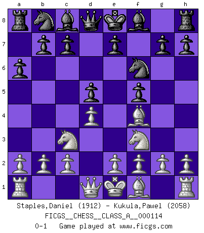 Last move : 0-1 2012 February 21 19:50:8 [Event "FICGS__CHESS__CLASS_A__000114"] [Site "FICGS"] [Date "2012.01.09"] [Round "1"] [White "Staples,Daniel"] [Black "Kukula,Pawel"] [Result "0-1"] [WhiteElo "1912"] [BlackElo "2058"] 1.d4 f5 2.Nc3 d5 3.Bf4 a6 4.Nf3 Nf6 0-1 This chess game has been lost on time (started : 2012.01.09 17:18:15) Dutch Player Black won this chess game. Follow this game move after move (download)Without error there can be no brilliancy. (Emanuel Lasker) Ich hatte Angst gegen einen russischen Großmeister zu verlieren, und er befürchtete gegen einen kleinen Jungen zu verlieren. (über ein Remis gegen Juri Awerbach). (Robert James Fischer) Bobby Fischer es el jugador de Ajedrez mas grande que jamás haya existido. (Ken Smith) C'est une question de caractère, Beaucoup de gens perdent leur motivation très vite. D'autres, ils sont rares, peuvent la conserver très longtemps. J'aime les échecs, encore aujourd'hui je suis heureux d'analyser des parties. J'aime toujours gagner, je déteste encore perdre. Bien jouer est important pour mon intégrité intellectuelle et morale. Et puis les échecs vivent en ce moment une période historique grâce à Internet. Ils se développent dans les systèmes éducatifs à travers le monde. Ils sortent de leur ghetto, et c'est mon rôle de mener à bien cette révolution. (Gary Kasparov) You can't play chess if you're groggy from pills. (Anatoly Karpov)