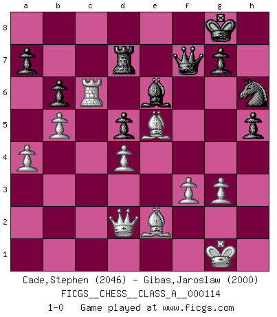 Last move : 1-0 2012 February 29 12:42:2 [Event "FICGS__CHESS__CLASS_A__000114"] [Site "FICGS"] [Date "2012.01.09"] [Round "1"] [White "Cade,Stephen"] [Black "Gibas,Jaroslaw"] [Result "1-0"] [WhiteElo "2046"] [BlackElo "2000"] 1.d4 f5 2.g3 Nf6 3.Bg2 e6 4.c4 c6 5.Nf3 d5 6.O-O Bd6 7.Qc2 O-O 8.Ne5 b6 9.Nc3 Bb7 10.cxd5 cxd5 11.Nb5 Ng4 12.Nxg4 fxg4 13.e4 Qd7 14.Nxd6 Qxd6 15.Bf4 Qd7 16.Rac1 Nc6 17.Rfe1 Rf7 18.exd5 exd5 19.Qd3 Raf8 20.a3 Rc8 21.b4 Ne7 22.Rxc8+ Bxc8 23.b5 Nf5 24.a4 Re7 25.Rc1 Qe6 26.h3 gxh3 27.Bxh3 Bd7 28.Bg2 h6 29.Be5 Qf7 30.Qd1 h5 31.Qd2 Be6 32.Qg5 Nh6 33.f3 Rb7 34.Rc6 Rd7 35.Bf1 Qf5 36.Rc8+ Kh7 37.Qd2 Qf7 38.Rc6 Kg8 39.Be2 1-0 Dutch defense Kingside Castling by player White (move 6) Kingside Castling by player Black (move 7) Player White won this chess game. Follow this game move after move (download)The essence of Chess is thinking about what Chess is. (David Bronstein) Ich habe Kasparov in Rente geschickt. (Veselin Topalov) La belleza de un movimiento no se refleja solo en su apariencia, sino en el pensamiento detrás de él. (Siegbert Tarrasch) Roi des jeux et jeu des rois, les échecs portent en eux un sentiment d'infini. Ils donnent à celui qui s'est efforcé d'en approfondir les arcanes l'impression de n'être pas à la mesure de l'homme; en fait, ils constituent un résumé de l'univers, un microcosme, et figurent cette grande échelle qui, dans les plans de la lumière descend jusqu'à la matière, qui des abîmes insondables remonte jusqu'en l'infini de Dieu. (Pyrame) Go and wake up your luck. (Persian saying)