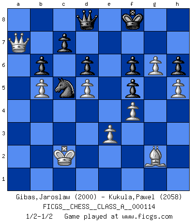 Last move : 1/2-1/2 2012 August 15 11:30:5 [Event "FICGS__CHESS__CLASS_A__000114"] [Site "FICGS"] [Date "2012.01.09"] [Round "1"] [White "Gibas,Jaroslaw"] [Black "Kukula,Pawel"] [Result "1/2-1/2"] [WhiteElo "2000"] [BlackElo "2058"] 1.d4 f5 2.c4 e6 3.Nc3 Nf6 4.Nf3 Bb4 5.g3 b6 6.Bg2 Bxc3+ 7.bxc3 Bb7 8.O-O O-O 9.d5 exd5 10.Nh4 Ne4 11.cxd5 Qf6 12.Ba3 Re8 13.c4 Na6 14.Qc2 Nac5 15.Bb2 Qg5 16.Nf3 Qh5 17.Nd4 Nd6 18.a4 a5 19.e3 Rac8 20.Rab1 Ba6 21.Nb5 Nf7 22.Bd4 Bxb5 23.cxb5 d6 24.f4 Nh6 25.Rbe1 Rcd8 26.Re2 Ng4 27.h3 Nf6 28.Bxf6 gxf6 29.Kh2 Rd7 30.Bf3 Qg6 31.Qc4 Rde7 32.Rfe1 Kg7 33.Qd4 Nb3 34.Qc3 Nc5 35.Rg2 Nxa4 36.Qd4 Nc5 37.g4 Kh8 38.g5 Rf8 39.Reg1 Nd7 40.Bd1 a4 41.Qc3 Rfe8 42.Rg3 Qg7 43.Bh5 Rc8 44.Qc2 a3 45.g6 h6 46.Qa4 Nc5 47.Qxa3 Re4 48.Bd1 Rc4 49.R3g2 Ne4 50.Qd3 Rc5 51.Bf3 Re8 52.Ra1 Kg8 53.Ra4 Nc3 54.Ra3 Ne4 55.h4 Qd7 56.Be2 Kg7 57.h5 Rc1 58.Rg1 Nc5 59.Qd2 Rxg1 60.Kxg1 Re4 61.Bd3 Ra4 62.Rxa4 Nxa4 63.Qa2 Nc5 64.Be2 Qe8 65.Kf2 Ne4+ 66.Ke1 Nc5 67.Qa7 Qc8 68.Bf3 Qd8 69.Kd1 Kf8 70.Bg2 Kg7 71.Bh3 Qc8 72.Kc2 Kf8 73.Bg2 Qd8 1/2-1/2 Dutch defense, Rubinstein variation Kingside Castling by player White (move 8) Kingside Castling by player Black (move 8) This chess game ended in a draw. Follow this game move after move (download)Half the variations which are calculated in a tournament game turn out to be completely superfluous. Unfortunately, no one knows in advance which half. (Jan Tinman) Drei Punkte vor allen anderen ist wie einer, der im weißen Anzug posiert, während der Rest in Müllsäcke gekleidet dasteht. (Viktor Kortschnoi) Ayuda a tus piezas para que ellas te puedan ayudar. (Paul Morphy) Pour moi, les échecs ne sont pas un jeu mais un art. (Alexandre Alekhine) The only thing that matters is the evidence. (Horatio Caine, C.S.I. Miami)