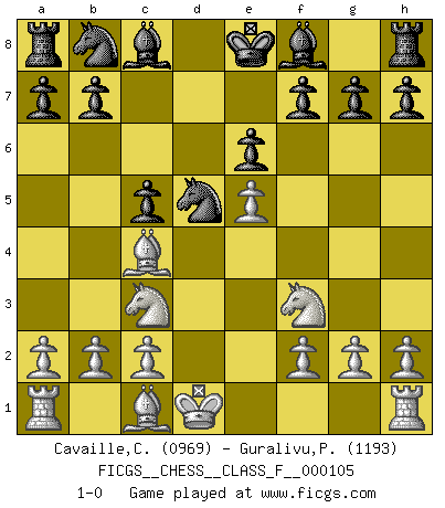 Last move : 1-0 2012 January 23 12:41:0 [Event "FICGS__CHESS__CLASS_F__000105"] [Site "FICGS"] [Date "2012.01.11"] [Round "1"] [White "Cavaille,Cedric"] [Black "Guralivu,Paul-Iosif"] [Result "1-0"] [WhiteElo "0969"] [BlackElo "1193"] 1.e4 c5 2.Nf3 d6 3.Bc4 e6 4.d4 Nf6 5.e5 dxe5 6.dxe5 Qxd1+ 7.Kxd1 Nd5 8.Nc3 1-0 Sicilian Player White won this chess game. Follow this game move after move (download)No Chess Grandmaster is normal; they only differ in the extent of their madness. (Viktor Korchnoi) Kostenjuk hat keinen Sexappeal. (Loek van Wely) No hay otro maestro que tenga una voluntad terrífica de ganar. Al tablero, el irradía peligro y aún los oponentes mas fuertes tienden a congelarse como liebres cuando olfatean a una pantera. Aún sus debilidades son peligrosas. Con las blancas, su juego de apertura es predecible - te es posible hacer planes en su contra - pero es tan fuerte que tus planes casi nunca funcionan. En el juego medio, su precisión e invención son fabulosas y en finales, tú simplemente no le puedes vencer. (Experto Alemán anónimo) La vérité est comme le meilleur coup aux échecs : elle existe, mais il faut la chercher. (Arturo Perez-Reverte) Secret operations are essential in war; upon them the army relies to make its every move. (Sun Tzu)