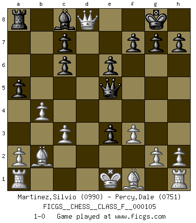 Last move : 1-0 2012 February 8 3:13:38 [Event "FICGS__CHESS__CLASS_F__000105"] [Site "FICGS"] [Date "2012.01.11"] [Round "1"] [White "Martinez,Silvio"] [Black "Percy,Dale"] [Result "1-0"] [WhiteElo "0990"] [BlackElo "0751"] 1.e4 e6 2.Nf3 Nf6 3.Nc3 d5 4.e5 Ne4 5.Nxe4 dxe4 6.Ng1 Bc5 7.f3 Bf2+ 8.Kxf2 Qd4+ 9.Ke1 O-O 10.Ne2 Qxe5 11.c3 Nc6 12.b4 Rd8 13.Bb2 e3 14.d4 Rxd4 15.Nxd4 a5 16.Nxc6 bxc6 17.Qd8+ 1-0 French defense Kingside Castling by player Black (move 9) Player White won this chess game. Follow this game move after move (download)The tactician must know what to do whenever something needs doing; the strategist must know what to do when nothing needs doing. (Savielly Tartakover) Sie führen leise Selbstgespräche, schlürfen lautstark ihre Getränke, schmatzen hörbar beim Essen, blasen ihrem Gegenüber Rauch in die Augen, niesen ihm ins Gesicht, starren ihn unverwandt an, bis er sich unter ihren Blicken windet, rutschen ständig auf ihrem Stuhl hin und her, rülpsen und bohren in der Nase. (Anonymous) Botvinnik trató de alejar el misterio referente al Ajedrez, siempre relacionandolo a situaciones de la vida diaria. Solía llamar al Ajedrez un problema inexacto típico, similar a aquellos en que la gente tiene siempre que resolver a cada día. (Garry Kasparov) Je ne suis pas le dernier à jouer lâchement des coups douteux pendant le zeïtnot de l'adversaire pour l'achever: en effet les coups qui font le plus peur sont ceux que l'on ne comprend pas. Je me fais souvent peur quand je joue. (Un professeur anonyme) They say in chess you've got to kill the queen, and then you mate it... Oh I, do you ? (Red Hot Chili Peppers, Fortune faded)