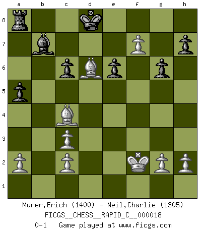 Last move : 0-1 2007 April 19 5:37:25 [Event "FICGS__CHESS__RAPID_C__000018"] [Site "FICGS"] [Date "2007.01.15"] [Round "1"] [White "Murer,Erich"] [Black "Neil,Charlie"] [Result "0-1"] [WhiteElo "1400"] [BlackElo "1305"] 1.e4 c5 2.Nf3 Nc6 3.d4 cxd4 4.Nxd4 e6 5.Nc3 Bb4 6.Nxc6 Bxc3+ 7.bxc3 bxc6 8.Qd6 Qf6 9.Rb1 e5 10.Ba3 Qxd6 11.Bxd6 Nf6 12.f3 a5 13.Bc4 Ng8 14.Bxe5 Ne7 15.Bd6 Ng6 16.f4 f6 17.Rb6 f5 18.Kf2 fxe4 19.Re1 Kd8 20.Rxe4 Re8 21.Rxe8+ Kxe8 22.Rb1 Nf8 23.f5 g6 24.Re1+ Kd8 25.f6 Ne6 26.f7 Bb7 27.Rxe6 dxe6 0-1 This chess game has been lost on time (started : 2007.01.15 8:31:35) Sicilian defense Player Black won this chess game. Follow this game move after move (download)War is the child of passion, passion is the child of narcissism and narcissism is the child. (...) Another game ? (Thibault de Vassal) Wenn Spassky eine Figur opfert kannst du genauso gut aufgeben. Aber wenn Tal eine Figur opfert, spiel weiter. Er könnte noch eine weitere opfern, und dann ... wer weiß? (Miguel Najdorf) El Ajedrez hace al hombre ser mas sabio y ver mas claro. (Vladimir Putin) J'apprécie les joueurs d'est-indienne, c'est grâce à eux que je nourris ma famille depuis tant d'années. (Petrosian) Men never do evil so completely and cheerfully as when they do it from religious conviction. (Blaise Pascal)