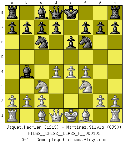 Last move : 0-1 2012 February 22 19:52:31 [Event "FICGS__CHESS__CLASS_F__000105"] [Site "FICGS"] [Date "2012.01.11"] [Round "1"] [White "Jaquet,Hadrien"] [Black "Martinez,Silvio"] [Result "0-1"] [WhiteElo "1213"] [BlackElo "0990"] 1.e4 Nc6 2.f4 e6 3.Nf3 Nf6 4.Nc3 Bc5 5.d4 Bb4 0-1 This chess game has been lost on time (started : 2012.01.11 22:49:19) KP : Nimzovich defense Player Black won this chess game. Follow this game move after move (download)If your opponent cannot do anything active, then don't rush the position; instead you should let him sit there, suffer, and beg you for a draw. (Jeremy Silman) Obwohl ich alt bin, darf mir niemand den Finger in den Mund stecken, sonst beisse ich. (Wilhelm Steinitz) Bendita sea la memoria de aquel que dio al mundo este juego inmortal. (A. G. Gardiner) Les échecs sont utiles à l'exercice de la faculté de penser et à celle de l'imagination. Car nous devons posséder une méthode élaborée pour atteindre des buts partout où nous devons conduire notre raison. (Leibnitz) Luck never gives; it only lends. (Swedish proverb)