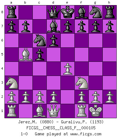 Last move : 1-0 2012 January 23 12:42:22 [Event "FICGS__CHESS__CLASS_F__000105"] [Site "FICGS"] [Date "2012.01.11"] [Round "1"] [White "Jerez,Miriam"] [Black "Guralivu,Paul-Iosif"] [Result "1-0"] [WhiteElo "0880"] [BlackElo "1193"] 1.e4 c5 2.Na3 d6 3.Nf3 Nc6 4.Bb5 Bd7 5.O-O 1-0 Sicilian defense Kingside Castling by player White (move 5) Player White won this chess game. Follow this game move after move (download)A man without frontiers. He didn't divide the East and the West, he brought them together in their admiration for him. (Ljubomir Ljubojevic, about Bobby Fischer's death) Karpov ist ein Museumsstück. (Garry Kasparov) Las piezas de Ajedrez son los bloques del alfabeto que moldean los pensamientos; y esos pensamientos, aunque hagan un diseño visual en el tablero, expresan abstractamente su belleza como un poema. (Marcel Duchamp) La tactique, c'est ce que vous faites quand il y a quelque chose à faire; la stratégie, c'est ce que vous faites quand il n'y a rien à faire. (Savielli Tartacower) Life is like a ten-speed bicycle: most of us have gears we never use. (Charles M. Schulz)