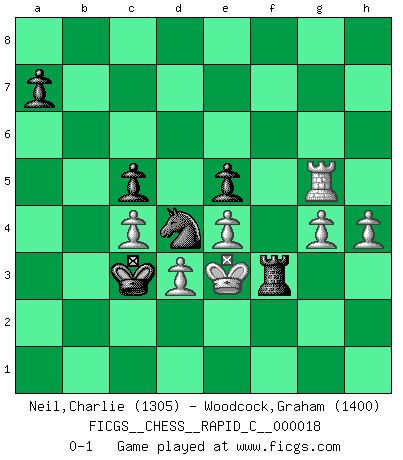 Last move : 0-1 2007 May 14 18:24:21 [Event "FICGS__CHESS__RAPID_C__000018"] [Site "FICGS"] [Date "2007.01.15"] [Round "1"] [White "Neil,Charlie"] [Black "Woodcock,Graham"] [Result "0-1"] [WhiteElo "1305"] [BlackElo "1400"] 1.e4 c5 2.Nc3 d6 3.Nge2 Nc6 4.g3 e5 5.Bg2 Nf6 6.O-O g6 7.d3 Bg7 8.Bg5 Bg4 9.f3 Be6 10.f4 Bg4 11.Qd2 Qb6 12.Rab1 Nb4 13.Kh1 Nd7 14.fxe5 Nxe5 15.a3 Nbc6 16.Nd5 Qa5 17.Qxa5 Nxa5 18.Nc7 Kd7 19.Nxa8 Bxe2 20.Bh3+ Kc6 21.Rf2 Bf3+ 22.Kg1 Bg4 23.Bxg4 Nxg4 24.Rxf7 Bd4+ 25.Kg2 Rxa8 26.Rxh7 b6 27.Rf1 Bxb2 28.a4 Bd4 29.R1f7 b5 30.Bd2 Kb6 31.axb5 Kxb5 32.c4+ Ka6 33.Rfg7 Bxg7 34.Rxg7 Nb3 35.Bf4 Ne5 36.Bxe5 dxe5 37.Rxg6+ Ka5 38.Kf3 Nd4+ 39.Ke3 Rf8 40.h4 Kb4 41.g4 Kc3 42.Rg5 Rf3+ 0-1 Sicilian : Closed Kingside Castling by player White (move 6) Player Black won this chess game. Follow this game move after move (download)Chess is imagination. (David Bronstein) Über Frauen: Chess is better. (Robert James Fischer) Repentinamente, me resultaba obvio en mi analisis que yo había pasado por alto lo que Fischer había visto en el tablero con la mas grande facilidad. (Mikhail Botvinnik) Aidez vos pièces, elles vous aideront. (Paul Morphy) We cannot be sure of having something to live for unless we are willing to die for it. (Ernesto Che Guevara)