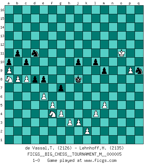 Last move : 1-0 2013 October 11 23:56:6 [Event "FICGS__BIG_CHESS__TOURNAMENT_M__000005"] [Site "FICGS"] [Date "2012.01.12"] [Round "1"] [White "de Vassal,Thibault"] [Black "Lehnhoff,Heinz-Georg"] [Result "1-0"] [WhiteElo "2126"] [BlackElo "2135"] 1.j2-k4 m15-m13 2.h1-l4 j15-k13 3.m2-m4 e15-e13 4.e2-e4 h16-o10 5.h2-g4 h15-g13 6.p1-o3 k16-h15 7.b1-c3 d15-d13 8.f1-b5 g16-j15 9.d2-d3 n15-n13 10.l1-p5 p16-q14 11.c1-h6 l16-p12 12.k1-h2 c15-c14 13.g1-f3 b16-a14 14.f3-h4 m13-m12 15.n2-n3 e13-e12 16.l4-p8 c16-l8 17.e1-e3 e16-e14 18.e3-f3 e14-f14 19.f3-f14 h15-f14 20.m1-m3 p12-n10 21.p8-p13 o15-o14 22.p13-j7 f16-c13 23.j7-c7 o16-g9 24.m3-l3 j16-h15 25.c7-b8 l8-c16 26.o1-j6 n10-l12 27.l3-l12 c13-e11 28.b8-p8 q14-o13 29.l12-l6 p15-p14 30.q1-m1 a14-c13 31.q2-q4 m16-m14 32.m1-m3 c16-g12 33.h2-k3 g12-f11 34.l6-o6 o10-b10 35.j1-j2 c13-d11 36.a2-a4 a15-a13 37.c3-d5 f14-h13 38.m3-l3 k13-l11 39.o6-o9 j15-k13 40.h6-j5 o13-n11 41.o9-p9 o14-o13 42.p8-q9 b10-h10 43.q9-k15 h13-j15 44.k15-q9 a13-a12 45.a1-e1 b15-b13 46.p5-o4 h10-k12 47.m4-m5 g9-j11 48.p2-p3 f15-f14 49.o3-m4 a16-k16 50.b2-b4 k12-h12 51.m4-k5 d11-e13 52.o4-n5 e13-c12 53.n5-m4 e11-f12 54.j5-k6 f12-g11 55.k6-g9 n11-p12 56.o2-o4 m14-k14 57.l3-l10 j11-g9 58.m4-g9 k13-j11 59.l10-c10 k14-k9 60.g9-m4 q15-q13 61.q4-q5 k16-k14 62.p3-p4 q16-k16 63.c10-c9 k9-c9 64.p9-c9 k14-k9 65.c9-k9 k16-k9 66.q9-o7 f11-h13 67.o7-j7 j11-h9 68.j7-q7 h9-k8 69.j6-f9 j15-k13 70.p4-p5 k8-m9 71.q5-q6 h12-j11 72.q7-j7 j11-m14 73.j7-h7 l15-l14 74.e1-e3 h13-f11 75.f9-g10 k9-k10 76.g10-f11 g13-f11 77.e3-g3 g11-e13 78.g4-j5 f11-g13 79.g3-g6 k10-c10 80.c2-c3 c10-c11 81.h7-m7 c11-f11 82.g6-f6 f11-f6 83.d5-f6 m14-f8 84.j5-h7 f8-f11 85.k4-h5 f14-f13 86.l2-l4 g15-g14 87.m7-j7 f11-c11 88.f6-d5 m9-n11 89.j7-c13 c12-d14 90.c13-c11 e13-c11 91.d5-f6 g13-f11 92.d3-d4 g14-g13 93.c3-c4 h14-h13 94.c4-c5 h15-g14 95.b5-c4 n11-m13 96.a4-a5 d13-d12 97.b4-b5 c14-c13 98.a5-a6 f13-f12 99.b5-b6 g13-g12 100.a6-a7 b13-b12 101.c4-f7 a12-a11 102.k5-l7 g14-g13 103.f6-g8 h13-h12 104.h4-j6 j14-j13 105.j6-k8 p12-n11 106.k3-j5 p14-p13 107.j5-k7 q13-q12 108.f2-f4 n13-n12 109.q6-q7 j13-j12 110.p5-p6 o13-o12 111.o4-o5 p13-p12 112.n3-n4 j12-j11 113.k7-j9 l11-j12 114.q7-q8 p12-p11 115.p6-p7 g13-h13 116.o5-o6 m13-l11 117.n4-n5 f11-g13 118.q8-q9 e12-e11 119.p7-p8 q12-q11 120.o6-o7 c11-m2 121.n5-n6 m2-o4 122.l7-j8 f12-f11 123.a7-a8 q11-q10 124.b6-b7 h12-h11 125.c5-c6 g12-g11 126.d4-d5 m12-m11 127.e4-e5 g11-g10 128.a8-a9 h11-h10 129.j8-l9 h10-j9 130.g8-j9 d14-e12 131.b7-b8 e12-f10 132.c6-c7 f10-g12 133.d5-d6 k13-h12 134.j9-k11 h12-j14 135.m4-h8 j14-k12 136.k11-m10 g13-h11 137.k8-j10 l11-j10 138.l9-j10 k12-j10 139.f7-j10 h11-k12 140.j10-g12 h13-g12 141.m10-n12 j12-k10 142.h8-j9 o4-j9 143.h7-j9 g12-g11 144.h5-j7 f11-f10 145.j7-k9 j11-j10 146.k9-m10 b12-b11 147.j9-l8 k10-j8 148.l8-j7 f10-f9 149.m10-l8 g11-h10 150.n12-m10 c13-c12 151.j7-h5 c12-c11 152.m10-k11 h10-g11 153.k11-m10 g11-h10 154.l8-k6 j8-k10 155.m10-l8 k10-h11 156.j2-k3 d12-d11 157.k3-j4 a11-a10 158.h5-f6 d11-d10 159.k6-h7 g10-g9 160.l8-j7 n11-l10 161.d6-d7 e11-e10 162.c7-c8 e10-e9 163.f6-d5 g9-g8 164.h7-f6 h10-g9 165.j7-g6 h11-f10 166.d5-c7 k12-h11 167.e5-e6 h11-f12 168.f4-f5 f12-d11 169.g2-g4 c11-c10 170.j4-k5 l14-l13 171.k5-k6 l13-l12 172.k6-l7 l12-l11 173.o7-o8 o12-o11 174.l7-m7 d10-d9 175.m7-n8 l10-n11 176.p8-p9 o11-o10 177.g6-j7 m11-m10 178.j7-l6 o10-o9 179.n8-m7 d9-d8 180.c7-a8 f10-h9 181.n6-n7 g9-h8 182.n7-n8 g8-g7 183.f6-h5 e9-e8 184.d7-e8 f9-e8 185.h5-f4 h8-j8 186.l6-m8 h9-k8 187.m7-n7 o9-n8 188.n7-n8 q10-p9 189.o8-p9 l11-l10 190.m8-o9 m10-m9 191.n8-n9 k8-m7 192.n9-n10 n11-o13 193.n10-o11 m7-o8 194.o9-p11 o13-p11 195.o11-p11 o8-q9 196.p11-o11 1-0 Follow this game move after move (download)Winning isn't everything... but losing is nothing. (Mednis) Das ganze Leben mit einer Ehefrau ist wie ein Endspiel mit ungleichfarbigen Läufern. (Viktor Kortschnoi) Dios mío, Bobby Fischer juega tan simple. (Alexei Suetin) Il n'y a plus de joueurs du niveau de Jacob Murray dont la seule quête est le beau jeu, le plaisir de voir les pièces construire quelque chose. Sur 10 idées à la minute, 9 seront sans intérêt, la dernière s'avèrera géniale. (Christian Bauer) He who defends everything defends nothing. (Frederick the Great)