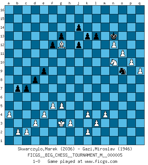 Last move : 1-0 2013 January 29 21:58:13 [Event "FICGS__BIG_CHESS__TOURNAMENT_M__000005"] [Site "FICGS"] [Date "2012.01.12"] [Round "1"] [White "Skwarczylo,Marek"] [Black "Gazi,Miroslav"] [Result "1-0"] [WhiteElo "2036"] [BlackElo "1946"] 1.j2-k4 j15-k13 2.h1-o7 h15-g13 3.o7-o15 m15-m13 4.o15-o7 e15-e13 5.m2-m4 n15-n13 6.l1-o4 p16-o14 7.n2-n3 f16-b12 8.g1-j2 l16-p12 9.e2-e4 b16-c14 10.f1-c4 o16-f8 11.d2-d3 d15-d14 12.h2-g4 c16-l8 13.k1-h2 h16-l13 14.p1-o3 m16-o16 15.o7-l7 b12-d10 16.l7-b7 a16-b16 17.b1-c3 k16-h15 18.o1-g8 l15-l14 19.c1-k8 g16-e15 20.m1-m3 o14-n12 21.m3-l3 l13-p9 22.q1-p1 o16-o9 23.o4-p3 o9-b9 24.b7-f7 h15-j13 25.c4-b3 l8-f13 26.l3-l5 q15-q13 27.p1-m1 j16-h15 28.e1-e3 e16-o16 29.a1-e1 f8-g7 30.e3-f3 o16-o7 31.f7-d5 b16-o16 32.f3-f7 o16-o9 33.f7-d7 d10-b12 34.g8-d11 f13-d11 35.d7-d11 f15-f13 36.m1-m3 g7-k4 37.j2-k4 b12-k4 38.j3-k4 p12-j6 39.m3-j3 j6-d11 40.d5-d11 o9-o11 41.d11-d4 o11-o13 42.l2-l3 p9-f9 43.j1-j2 f9-b13 44.l5-p5 p15-p13 45.h2-k3 q16-o16 46.e1-j1 j13-l12 47.p5-n5 l12-m14 48.k8-j9 m13-m12 49.j2-h2 b9-b4 50.d4-e3 b13-b11 51.c3-d5 b4-b9 52.j9-c3 o7-h7 53.d5-f6 h7-h11 54.o3-m2 h11-j11 55.j3-j11 k13-j11 56.p3-q4 j11-h13 57.e3-j7 o13-o9 58.j7-h7 o16-o12 59.j1-j7 b9-j9 60.n5-j5 j9-j7 61.j5-j7 o9-o11 62.q4-p3 o11-h11 63.h7-g8 o12-o11 64.g8-n14 o11-o13 65.j7-n7 b11-b8 66.c3-e5 b8-o8 67.n7-n4 h11-o11 68.n4-o4 o8-l8 69.o4-o11 l8-o11 70.e5-d6 m14-k13 71.n14-n15 h15-j15 72.b3-n14 o13-o16 73.n15-o16 o11-o16 74.d6-o16 l14-l13 75.o16-p15 k13-l15 76.n14-g8 l15-n16 77.p15-n13 n16-m14 78.k3-l5 h13-k12 79.m2-n4 k12-m11 80.n13-q10 m11-o10 81.f2-f4 a15-a13 82.p3-h10 k15-k14 83.g4-h6 p13-p12 84.g2-g4 p12-p11 85.q10-n7 o10-m9 86.n7-m6 m9-o10 87.n4-o6 g13-j12 88.h10-j9 q13-q12 89.g4-g5 q12-q11 90.n3-n4 q11-q10 91.n4-n5 q10-q9 92.l5-m7 f13-f12 93.f6-h7 c14-d12 94.h7-k8 d12-c10 95.k8-l10 c10-e9 96.g8-e6 j12-l11 97.j9-g7 e9-g10 98.g7-a13 b15-b14 99.a13-g7 e15-f13 100.m7-n9 f13-e11 101.h6-j8 g15-g13 102.o6-q7 l11-k9 103.n9-p10 k9-h8 104.j8-l9 h8-j6 105.g7-j5 g10-h8 106.j5-g3 h8-g6 107.e6-g4 j6-h8 108.f4-f5 g6-j7 109.l10-m8 j7-g8 110.m8-o9 h8-f7 111.m6-k8 f7-g9 112.l9-n10 g9-j10 113.k8-m6 g8-f10 114.n10-p11 f10-g12 115.p11-n12 m14-n12 116.o9-p7 g12-j13 117.q7-o8 j10-l11 118.o8-q9 o10-q9 119.p7-q9 c15-c13 120.o2-o4 b14-b13 121.o4-o5 b13-b12 122.o5-o6 b12-b11 123.p2-p4 c13-c12 124.p4-p5 c12-c11 125.p5-p6 d14-d13 126.p6-p7 d13-d12 127.q2-q4 b11-b10 128.q4-q5 c11-c10 129.q5-q6 b10-b9 130.q6-q7 d12-d11 131.q7-q8 d11-d10 132.q9-o10 n12-o10 133.g3-o10 c10-c9 134.o10-n9 d10-d9 135.n9-l11 m12-l11 136.m6-o8 l11-l10 137.o8-j13 h14-j13 138.p10-n9 c9-c8 139.n9-l10 b9-b8 140.h2-g3 b8-b7 141.n5-n6 j15-k15 142.n6-n7 c8-c7 143.n7-n8 k15-l14 144.n8-n9 l14-m13 145.o6-o7 m13-l12 146.o7-o8 l12-l11 147.l10-m8 e11-g10 148.p7-p8 j13-j12 149.o8-o9 k14-k13 150.p8-p9 d9-d8 151.o9-o10 e13-e12 152.n9-n10 e12-e11 153.n10-n11 e11-e10 154.n11-n12 l11-m12 155.o10-o11 g10-j11 156.m8-n10 m12-n13 157.p9-p10 j11-l12 158.q8-q9 l12-n11 159.a2-a4 e10-e9 160.g4-l8 n11-o9 161.l8-g12 1-0 Follow this game move after move (download)A man that will take back a move at Chess will pick a pocket. (Richard Fenton) Heutzutage gewinnt im Turnier nicht derjenige Spieler, der weitreichende Pläne entwirft, sondern einfach jener, der Zug um Zug kämpft. (David Bronstein) El Ajedrez es imaginación. (David Bronstein) Les échecs sont un jeu terrible. Si vous n'avez pas le centre, votre adversaire a une position plus libre. Par contre, si vous avez le centre, alors vous avez vraiment quelque chose pour laquelle vous inquiéter ! (Siegbert Tarrasch) Drag your thoughts away from your troubles... by the ears, by the heels, or any other way you can manage it. (Mark Twain)