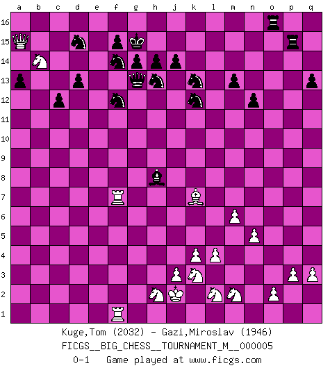 Last move : 0-1 2012 February 11 1:3:48 [Event "FICGS__BIG_CHESS__TOURNAMENT_M__000005"] [Site "FICGS"] [Date "2012.01.12"] [Round "1"] [White "Kuge,Tom"] [Black "Gazi,Miroslav"] [Result "0-1"] [WhiteElo "2032"] [BlackElo "1946"] 1.n2-n4 j15-k13 2.h2-g4 h16-o10 3.p1-o3 o10-c10 4.j2-k4 c10-c2 5.e2-e4 c2-c7 6.e4-e5 h15-g13 7.f2-f4 e15-e13 8.g1-f3 f16-c13 9.m2-m4 c13-k6 10.h3-h4 m15-m13 11.k1-l3 l16-p12 12.f3-h2 c7-j7 13.g2-g3 n15-n13 14.h1-a8 g15-g14 15.b1-c3 j7-g9 16.f1-h3 d15-d13 17.f4-f5 c16-l8 18.a8-a4 b16-d15 19.o1-h7 o16-j11 20.h7-g6 g9-p9 21.l3-m5 k6-g9 22.m5-n3 p16-o14 23.g4-f6 k16-h15 24.g3-g4 g9-f8 25.k4-l6 l8-k7 26.m4-m5 g16-j15 27.d2-d4 d15-f14 28.l1-m2 f8-g9 29.q1-p1 e16-e14 30.m2-k4 p9-n9 31.n4-n5 e14-b14 32.a2-a3 f14-e12 33.k4-a13 b14-c14 34.d4-d5 h15-f14 35.c1-h6 j16-h15 36.a1-c1 m16-m14 37.c3-e4 c14-c1 38.e1-c1 b15-b14 39.a13-e9 c15-c13 40.p1-n1 q15-q13 41.c1-c9 n9-k12 42.j1-j2 g9-e7 43.c9-a9 a15-a13 44.a9-b9 f14-d15 45.g6-a12 e12-f14 46.f6-g8 e7-g9 47.g8-j9 k7-j8 48.j9-g8 p12-k7 49.h6-g7 o14-p12 50.g8-h6 j8-g10 51.a4-a7 k7-h9 52.e5-e6 g10-e12 53.b9-b3 m14-o14 54.h6-f7 g9-f8 55.m1-c1 f8-g7 56.e9-g7 o14-o8 57.b3-b8 o8-b8 58.a7-b8 h9-f7 59.a12-f7 l15-l14 60.l2-l4 a16-n16 61.h3-k5 q16-q14 62.k5-b13 q14-o14 63.f7-j10 g13-e14 64.b8-l8 o14-o8 65.l8-m7 n16-e16 66.k2-k4 o8-b8 67.b13-e10 b8-b10 68.j10-g8 e12-f13 69.m7-q11 p15-p14 70.b2-b4 e14-d12 71.e10-f9 j11-l9 72.g4-g5 b10-b7 73.g7-e5 l9-k10 74.f5-f6 k12-n12 75.e4-d6 b7-b11 76.q11-o9 b11-o11 77.o9-m9 o11-j11 78.c1-c3 k10-m12 79.l6-j5 p12-o10 80.m9-h5 n12-l10 81.q2-q3 f13-a8 82.e6-e7 e13-e12 83.b4-b5 e12-e11 84.g8-h7 l10-f10 85.f9-g8 e16-e13 86.d6-e8 f10-m10 87.e8-c7 a8-c10 88.e7-e8 e13-h13 89.h5-g4 c10-b11 90.d5-d6 o10-m9 91.d6-d7 m9-k8 92.h7-k5 m10-d10 93.e5-d6 j11-j7 94.g8-e6 h13-g13 95.c7-d5 b11-e8 96.c3-c8 j7-d7 97.c8-e8 d7-d6 98.d5-e7 d10-m10 99.e8-e11 k8-j10 100.m5-m6 m12-f6 101.k5-g8 f6-h8 102.e11-h11 h8-g9 103.e7-c8 j10-k12 104.h11-o11 d6-d8 105.o11-o15 g9-a3 106.g8-h7 n13-n12 107.o15-k15 m10-l11 108.k15-o15 d8-d4 109.g4-k7 l11-e5 110.e6-g4 d4-d2 111.j5-k3 g13-g7 112.k7-j8 g7-f7 113.o3-m2 f7-f8 114.j8-j5 f8-f2 115.n1-h1 f2-f4 116.g4-h3 a3-f8 117.j5-p11 e5-h8 118.h7-f9 h8-j9 119.o15-o9 j9-j13 120.n3-l2 f8-g7 121.p11-p14 k12-l10 122.o9-o15 f4-f9 123.p14-l14 l10-k12 124.l14-l8 f9-p9 125.p2-p3 p9-p13 126.h4-h5 d2-d8 127.l8-l7 g7-j9 128.l7-q12 d8-p8 129.q12-o10 j9-m12 130.o10-h10 j13-h12 131.h10-n10 p8-p11 132.n10-q10 h12-h5 133.q10-m10 m12-l11 134.m10-k8 h5-h8 135.k8-c15 p13-p16 136.h1-f1 d12-e14 137.c15-a15 h15-g15 138.h3-d7 l11-m12 139.d7-g4 p11-p15 140.o15-o5 h8-h11 141.o5-o7 h11-b5 142.o7-f7 j15-h13 143.c8-d10 p16-o16 144.d10-b9 b5-g5 145.b9-c11 g5-g13 146.g4-k7 e14-f12 147.c11-a12 c13-c12 148.a12-b14 m12-h8 0-1 Follow this game move after move (download)Fischer is under obligation to nobody. (Joseph Platz) Man gibt nur Pakete auf. (Paul Keres) Durante una competencia de Ajedrez, un Maestro de Ajedrez deberá ser una combinación de presa de caza y un Monge. (Alexander Alekhine) Les ravages du H expliquent la différence de niveau entre Tal et Thal [Abergel]. All art requires courage. (Anne Tucker)