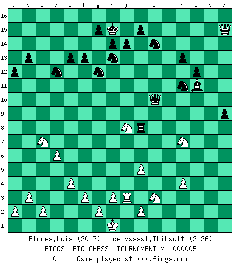 Last move : 0-1 2012 November 6 22:52:23 [Event "FICGS__BIG_CHESS__TOURNAMENT_M__000005"] [Site "FICGS"] [Date "2012.01.12"] [Round "1"] [White "Flores,Luis"] [Black "de Vassal,Thibault"] [Result "0-1"] [WhiteElo "2017"] [BlackElo "2126"] 1.j2-k4 j15-h13 2.h2-g4 m15-m13 3.m2-m4 e15-e13 4.e2-e4 p16-o14 5.p1-o3 l16-p12 6.g1-f3 h16-k14 7.b1-c3 f16-b12 8.d2-d4 k14-j13 9.h1-l4 m16-m14 10.j1-h1 b16-c14 11.k1-l3 m14-l14 12.l4-f9 g16-f14 13.n2-n4 n15-n14 14.f1-c4 j13-h12 15.f9-h7 h12-j11 16.l1-p5 j11-j9 17.h7-j7 j9-h10 18.f3-h4 b12-k4 19.j3-k4 h10-h4 20.c1-g5 h4-h10 21.j7-j4 l14-l11 22.f2-f3 o16-j11 23.p5-q6 l11-q11 24.g5-m10 o14-n12 25.m10-p7 o15-o13 26.c4-b3 k16-l14 27.a1-d1 j11-k12 28.p7-n5 h10-b10 29.q6-k12 l14-k12 30.o1-k5 q11-j11 31.j4-k3 d15-d14 32.m1-j1 j11-j1 33.q1-j1 q16-m16 34.j1-j3 c16-h11 35.m4-m5 m16-m14 36.h1-h2 h15-j13 37.e1-j1 m14-l14 38.j1-j2 f14-g12 39.d1-j1 e16-e14 40.j3-j8 c14-d12 41.j2-j5 a15-a13 42.j1-j3 b15-b13 43.k5-l6 a16-e16 44.k3-d9 h11-g10 45.j8-q8 g10-l6 46.m5-l6 q15-q13 47.j5-b5 b10-p10 48.n5-p3 p10-l6 49.q8-c8 c15-c13 50.b5-l5 l6-q6 51.l5-l14 k12-l14 52.c8-f8 e14-f14 53.f8-f14 g12-f14 54.d9-g9 j16-h15 55.g9-g7 a13-a12 56.g7-p15 q6-l1 57.j3-j2 l1-l2 58.p15-l15 l2-d9 59.d4-d5 n14-n13 60.l15-o15 h13-k12 61.o15-p15 d9-k9 62.k4-k5 k9-c16 63.p3-g11 h15-j15 64.d5-d6 f14-h13 65.g11-j9 e16-n16 66.p15-q14 o13-o12 67.j9-n5 n16-n14 68.n5-q8 j15-h15 69.q14-q15 n14-n15 70.q15-p14 c16-q16 71.b3-m13 k12-m13 72.p14-n12 m13-n11 73.n12-e12 f15-f13 74.e12-d13 q16-d16 75.q8-p7 d16-n7 76.h2-h1 n7-p7 77.d13-d14 p7-p2 78.o3-q4 p2-q2 79.q4-o5 n15-m15 80.o5-n3 q2-o2 81.n3-m5 o2-e11 82.d14-c13 j13-g12 83.c13-c6 e11-b8 84.b2-b3 m15-m10 85.c3-d5 m10-c10 86.d5-c7 b8-b10 87.j2-j3 q13-q12 88.c6-f9 q12-q11 89.f9-k9 c10-k10 90.k9-f5 q11-q10 91.g4-h6 q10-q9 92.f5-q15 p12-o11 93.h6-j8 k10-k8 94.m5-n7 b10-l10 0-1 Follow this game move after move (download)The blunders are all there on the board, waiting to be made. (Savielly Tartakover) Matt entspricht nicht immer den Tatsachen. (Savielly Grigorievitsch Tartakower) El tablero es el mundo, las piezas es el fenomeno del universo, las reglas del juego son lo que llamamos leyes de la naturaleza y el jugador del lado opuesto, se encuentra oculto a nuestra vista. (Thomas Huxley) Dieu déplace le joueur, et celui-ci la pièce. Quel Dieu derrière Dieu commence donc la trame ? Arturo Perez-Reverte (prix de littérature policière 1993). Life doesn't imitate art, it imitates bad television. (Woody Allen)