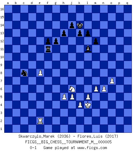 Last move : 0-1 2012 November 11 20:40:49 [Event "FICGS__BIG_CHESS__TOURNAMENT_M__000005"] [Site "FICGS"] [Date "2012.01.12"] [Round "1"] [White "Skwarczylo,Marek"] [Black "Flores,Luis"] [Result "0-1"] [WhiteElo "2036"] [BlackElo "2017"] 1.j2-k4 j15-k13 2.h1-o7 h15-g13 3.o7-o15 m15-m13 4.o15-o7 p16-o14 5.m2-m4 e15-e13 6.l1-o4 g16-f14 7.n2-n3 d15-d13 8.e2-e4 n15-n13 9.f1-b5 k16-l14 10.d2-d3 b16-c14 11.p1-o3 f16-b12 12.g1-j2 c16-g12 13.b1-c3 g12-h13 14.o7-j7 j16-k16 15.o1-f9 h16-o10 16.h2-g4 o16-f8 17.k1-h2 q16-o16 18.m1-m3 l16-o13 19.j7-m10 o10-k6 20.c1-j7 k6-b6 21.e1-e3 f8-k12 22.m10-m6 b6-a7 23.j7-k8 a16-d16 24.a2-a4 a7-a5 25.k8-h10 k12-h10 26.m6-h10 h13-l10 27.m3-l3 l10-j8 28.a1-e1 b12-d14 29.h10-c5 a5-f10 30.e3-f3 f10-p10 31.o4-p3 p10-b10 32.q1-m1 j8-h7 33.f9-h7 o13-h7 34.f3-f6 b10-p10 35.c5-b6 h7-a14 36.f6-p6 p10-m10 37.p6-p15 m10-q14 38.p15-p5 q14-d2 39.e1-d1 d2-q14 40.l3-l6 o16-p16 41.l6-q6 q14-o16 42.p5-o5 o16-n15 43.q6-o6 m16-o16 44.c3-d5 k16-j15 45.j2-h4 o14-n12 46.h2-j4 o16-o6 47.o5-o6 e16-o16 48.o6-o16 d16-o16 49.b5-c4 p16-p11 50.d5-f6 m13-m12 51.j4-l5 l14-j13 52.l5-j6 o16-o11 53.b2-b3 o11-b11 54.b6-e3 a14-e10 55.f2-f4 e10-h13 56.f4-f5 h13-k11 57.l2-l4 n15-p13 58.e3-p13 n12-p13 59.c4-k11 j13-k11 60.j1-j2 b11-c11 61.g4-e3 k11-l9 62.l4-l5 d14-a11 63.f6-h5 k13-l11 64.h4-g6 f14-g12 65.o3-n5 g12-f10 66.n5-l6 g13-h11 67.e3-c4 f15-f13 68.d1-f1 f13-f12 69.g6-h8 a11-e15 70.f1-f3 g15-g13 71.f3-g3 p13-n12 72.m1-f1 f10-e8 73.f1-f3 e15-c13 74.g3-g6 h11-g9 75.g6-b6 c13-b14 76.f3-g3 l9-m7 77.g3-g6 m7-o6 78.p3-n5 o6-p4 79.n5-p3 p4-o6 80.p3-q4 o6-n4 81.q4-p3 n4-p3 82.q2-p3 p11-o11 83.k4-m3 o11-q11 84.l6-n5 q11-q1 85.b6-c6 c11-k11 86.j6-k4 q1-c1 87.c4-e5 n12-p13 88.e5-f7 g9-h7 89.g6-e6 e8-g9 90.e6-q6 l11-n12 91.f7-g9 h7-g9 92.g2-g4 g9-h7 93.h8-j6 h7-f8 94.q6-q7 f8-h9 95.j6-g7 h9-f8 96.g7-e8 k11-o11 97.m3-o4 c1-o1 98.n5-m3 c14-d12 99.j2-k3 d12-e10 100.k3-l2 o1-c1 101.h3-h4 f8-d9 102.g4-g5 o11-c11 103.c6-c11 e10-c11 104.e8-c7 c1-c2 105.c7-d9 c11-d9 106.q7-d7 d9-c11 107.h5-f4 c2-b2 108.d7-b7 b2-f2 109.f4-e6 c15-c14 110.f5-f6 f2-d2 111.d3-d4 c11-d9 112.e4-e5 k15-k13 113.k4-h5 j15-k14 114.p3-p4 d2-d3 115.o4-n6 l15-l13 116.n6-l7 e13-e12 117.h5-f4 d3-c3 118.e6-c5 c3-f3 119.f4-e6 f3-f1 120.l7-n8 f1-p1 121.p2-p3 p1-d1 122.b7-b9 d9-f10 123.b9-o9 f10-g8 124.n8-o10 n12-m14 125.o10-p12 p13-o15 126.o9-o14 k14-l15 127.p12-q14 o15-p13 128.q14-o13 p13-n12 129.o14-o16 g8-j7 130.o13-m14 n12-m14 131.o16-b16 j7-h5 132.b16-b15 m14-k15 133.b15-j15 l15-k14 134.j15-j16 h5-g3 135.j16-n16 g3-f5 136.n16-n13 f5-d4 137.e6-d4 d1-d4 138.n13-n14 k14-j15 139.e5-e6 d4-d5 140.c5-b7 d5-d3 141.b7-c5 d3-c3 142.b3-b4 c3-c4 143.n14-q14 c4-b4 144.q14-q15 b4-c4 145.c5-d7 c4-a4 146.e6-e7 a4-a9 147.p4-p5 a9-p9 148.o2-o4 p9-n9 149.m3-n5 n9-d9 150.d7-f8 d9-d1 151.p5-p6 d1-n1 152.n5-l4 n1-p1 153.q15-q3 a15-a13 154.l2-m3 a13-a12 155.q3-q9 p1-p3 156.q9-a9 p3-p6 157.a9-a12 b14-e11 158.f8-d9 e11-h8 159.a12-a14 c14-c13 160.d9-c11 d13-d12 161.c11-e12 c13-c12 162.a14-a8 h8-e11 163.a8-c8 c12-c11 164.e12-d14 p6-p10 165.d14-f13 e11-g9 166.c8-d8 p10-p16 167.f13-d12 g9-f10 168.d8-d11 p16-d16 169.d11-c11 d16-d12 170.o4-o5 j15-k14 171.n3-n4 d12-d1 172.n4-n5 d1-m1 173.m3-n4 k15-m14 174.o5-o6 m14-n12 175.n4-m5 f10-e9 176.c11-k11 e9-n1 177.l4-n3 m1-m2 178.n3-l4 m2-q2 179.l4-m6 n1-o2 180.k2-k3 o2-n3 181.m6-k5 n3-l1 182.g5-g6 q2-f2 183.f6-f7 n12-m10 184.k11-j11 f2-g2 185.j11-j6 m10-k9 186.j6-h6 h14-h13 187.j3-j4 k9-m8 188.e7-e8 l1-m2 189.h6-h7 g2-g6 190.h4-h5 g6-f6 191.k5-h4 m8-l6 192.h4-j6 l6-j5 193.h7-g7 g13-g12 194.k3-k4 j5-h3 195.m5-l4 h3-f4 196.o6-o7 m2-q6 197.n5-n6 q6-l11 198.g7-k7 f4-d3 199.m4-m5 d3-e5 200.m5-m6 e5-f7 201.j4-j5 f7-d6 202.k7-e7 d6-c8 203.e7-e2 f6-f11 0-1 Follow this game move after move (download)Kasparov : J'adoube , Ivanchuk : S'il vous plaît ! (Garry Kasparov & Vassily Ivanchuk, Linares 1997) Alle offensichtlichen Züge sehen nach dem Spiel in der Analyse verdächtig aus. (Viktor Kortschnoi) Un mal plan es mejor que no tener ningún plan. (Frank Marshall) Ce qui est bien, c'est d'avoir tout un tas de pièces en prise : l'adversaire ne peut en prendre qu'une à la fois. Cité par Thierry Audin. I don't diet. I just don't eat as much as I'd like to. (Linda Evangelista, supermodel)