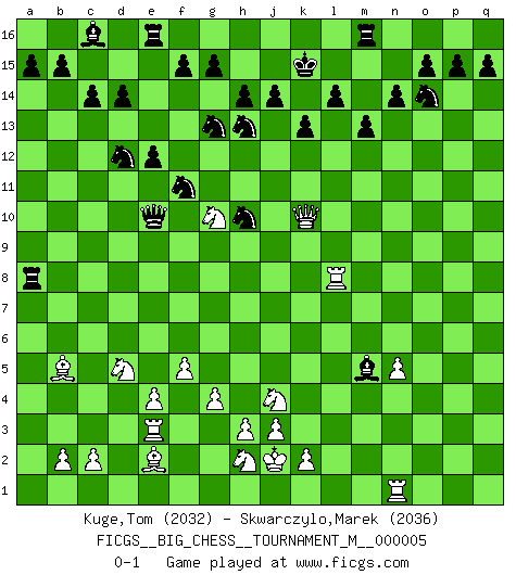 Last move : 0-1 2012 February 15 19:31:23 [Event "FICGS__BIG_CHESS__TOURNAMENT_M__000005"] [Site "FICGS"] [Date "2012.01.12"] [Round "1"] [White "Kuge,Tom"] [Black "Skwarczylo,Marek"] [Result "0-1"] [WhiteElo "2032"] [BlackElo "2036"] 1.n2-n4 j15-k13 2.p1-o3 h16-o10 3.h2-g4 m15-m13 4.d2-d4 l16-o13 5.e2-e4 n15-n14 6.j2-h4 e15-e13 7.k1-l3 p16-o14 8.m2-m4 f16-a11 9.g1-f3 b16-c14 10.b1-c3 d15-d14 11.f1-b5 g16-j15 12.c1-k8 o16-g9 13.l1-o4 c16-k9 14.o1-k5 e16-e14 15.h1-k3 a16-e16 16.k3-b11 o10-b10 17.b11-g11 g9-b4 18.a2-a4 e14-g14 19.g11-p11 o13-p14 20.j1-j2 a11-c13 21.f3-e5 b4-g9 22.e1-e3 g14-f14 23.g2-g3 h15-g13 24.f2-f4 k16-h15 25.k8-g5 g9-e7 26.o4-k8 c13-g9 27.e5-f7 f14-f7 28.k5-f9 e7-g5 29.k8-g5 g9-e7 30.b5-e8 f7-o7 31.g5-e7 b10-e7 32.m1-d1 o7-p7 33.p11-b11 e7-b7 34.b11-c10 p7-p2 35.o3-n5 p2-o2 36.q2-q4 m16-m14 37.c3-d5 k9-c16 38.a4-a5 q16-m16 39.a5-a6 b7-b14 40.h4-k5 g13-f11 41.e8-b5 c14-d12 42.c10-f7 k13-h12 43.f4-f5 f11-h10 44.f9-e8 h12-f11 45.f7-f10 m14-k14 46.m4-m5 d12-f13 47.f10-f8 b14-g9 48.f8-n8 j15-h13 49.e3-c3 c15-c14 50.a6-a7 f11-d10 51.e8-d7 o2-l2 52.a7-a8 g9-a9 53.l3-j4 f13-d12 54.n5-l6 l2-o2 55.d1-l1 k14-k5 56.a1-a6 k5-k12 57.l6-j7 l15-l14 58.d5-c7 a9-j9 59.j7-l8 j9-d4 60.d7-c6 d4-d2 61.g4-h2 d2-k8 62.b5-e2 k12-n12 63.n8-p6 n12-p12 64.p6-f6 d10-f11 65.l8-j9 p12-p2 66.l1-k1 h15-g13 67.j9-g10 o2-n2 68.q1-n1 n2-n1 69.k1-n1 p2-q2 70.f6-f10 k8-k14 71.f10-p1 q2-q4 72.c6-b5 q4-q7 73.c7-d5 q7-n7 74.n4-n5 k14-k5 75.p1-m4 e13-e12 76.a6-k6 k5-e10 77.c3-e3 n7-a7 78.m4-k4 k15-k13 79.k6-l6 j16-k15 80.k4-k8 a7-a2 81.k8-k10 a2-a8 82.g3-g4 p14-j8 83.l6-l8 j8-m5 0-1 Follow this game move after move (download)A bad plan is better than none at all. (Frank Marshall) Sie führen leise Selbstgespräche, schlürfen lautstark ihre Getränke, schmatzen hörbar beim Essen, blasen ihrem Gegenüber Rauch in die Augen, niesen ihm ins Gesicht, starren ihn unverwandt an, bis er sich unter ihren Blicken windet, rutschen ständig auf ihrem Stuhl hin und her, rülpsen und bohren in der Nase. (Anonymous) Tu no necesitas jugar muy bien, únicamente ayudar a tu oponenet a que juegue muy mal. (Genrikh Chepukaitis) 'L'échange des dames est un coup dur pour les deux adversaires...' Un journaliste lors d'une partie du match Spassky-Fischer Children in the dark cause accidents, accidents in the dark cause children. (Unknown)