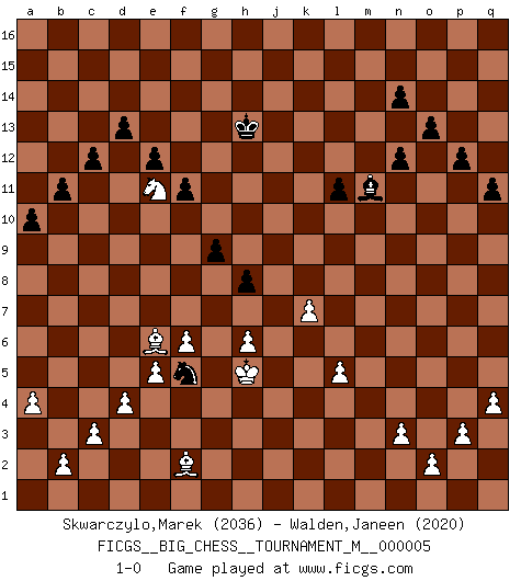 Last move : 1-0 2012 April 4 19:26:35 [Event "FICGS__BIG_CHESS__TOURNAMENT_M__000005"] [Site "FICGS"] [Date "2012.01.12"] [Round "1"] [White "Skwarczylo,Marek"] [Black "Walden,Janeen"] [Result "1-0"] [WhiteElo "2036"] [BlackElo "2020"] 1.j2-k4 h15-g13 2.h1-o7 m15-m13 3.e2-e4 j15-k13 4.f1-b5 g16-j15 5.d2-d3 p16-o14 6.b1-c3 b16-c14 7.m2-m4 e15-e13 8.l1-p5 f16-b12 9.g1-j2 l16-p12 10.n2-n3 n15-n14 11.p1-o3 d15-d14 12.o1-f9 c16-l8 13.c1-l9 k16-h15 14.h2-g4 o16-k12 15.k1-h2 l15-l13 16.m1-m3 a15-a13 17.q1-m1 c14-d12 18.e1-e3 c15-c13 19.a1-e1 f15-f13 20.m3-l3 e16-e14 21.e3-f3 h16-e16 22.o7-e16 a16-e16 23.l3-l7 o14-n12 24.m1-m3 o15-o13 25.m3-l3 l8-g12 26.f3-f6 q15-q13 27.e1-e3 b15-b13 28.e3-f3 a13-a12 29.o3-n5 b12-c11 30.q2-q4 b13-b12 31.l3-l5 a12-a11 32.f9-j6 p12-j6 33.f6-j6 p15-p13 34.j2-h4 p13-p12 35.h2-j4 q13-q12 36.h4-g6 q12-q11 37.c3-d5 k13-l11 38.l9-o12 q16-q15 39.a2-a4 e14-g14 40.g6-e7 g13-e12 41.e7-f9 l11-k9 42.l7-q7 g12-f11 43.p2-p3 f11-n4 44.q7-q9 k9-l11 45.l5-g5 e16-e14 46.j6-g6 g14-g6 47.g5-g6 g15-g13 48.j4-l5 n4-j8 49.g6-j6 j8-l10 50.f9-e11 l10-g14 51.e11-d9 h15-j13 52.d9-c11 e12-c11 53.p5-j11 k12-j11 54.j6-j11 j15-h13 55.j11-j7 k15-k13 56.k4-l6 j16-j15 57.g4-j5 j15-k14 58.j5-k7 h13-k12 59.l6-m8 h14-h13 60.l5-m7 g13-g12 61.m7-l9 f13-f12 62.m8-n10 l11-n10 63.l9-n10 j13-l12 64.k7-l9 j14-j13 65.d5-e7 c11-e10 66.e7-f9 q15-j15 67.n5-m7 h13-h12 68.m7-n9 g12-g11 69.n9-m11 k12-m11 70.l9-m11 m16-l16 71.f9-h8 d12-f13 72.b5-h11 e10-d12 73.h8-k9 e14-e15 74.k9-l11 j13-j12 75.h11-b5 h12-h11 76.q9-k9 f13-h14 77.m11-k10 l12-k10 78.k9-k10 k14-l14 79.f3-f5 g14-h13 80.f5-j5 j15-k15 81.o12-n13 l16-n16 82.l11-n12 m13-n12 83.j5-m5 k15-m15 84.j7-m7 n16-m16 85.k10-m10 m15-m10 86.m7-m10 m16-m10 87.m5-m10 e15-m15 88.m10-m15 l14-m15 89.l2-l4 k13-k12 90.l4-l5 h13-j14 91.n10-m8 j14-m11 92.e4-e5 m15-l14 93.c2-c3 l14-m13 94.n13-k16 h14-f13 95.k16-q10 f13-e11 96.d3-d4 g11-g10 97.g2-g4 f12-f11 98.f2-f4 e11-f9 99.j1-h2 e13-e12 100.q10-m6 d12-f13 101.b5-d7 c13-c12 102.m6-f12 b12-b11 103.m8-k7 a11-a10 104.k7-j9 d14-d13 105.j9-g8 j12-j11 106.g8-f10 h11-h10 107.h2-g3 m11-k9 108.f10-d9 h10-h9 109.d9-c11 f9-e11 110.d7-e8 l13-l12 111.f4-f5 k12-k11 112.g3-f4 k9-g12 113.g4-g5 j11-j10 114.f5-f6 g12-h13 115.g5-g6 h13-f15 116.g6-g7 e11-g12 117.c11-d9 f13-d12 118.f4-g5 d12-e10 119.f12-j15 e10-g9 120.e8-h5 g12-h10 121.k2-k4 h10-j8 122.j3-j4 g9-h7 123.g5-g6 h7-k8 124.k4-k5 k8-l10 125.j4-j5 j8-l7 126.k5-k6 l7-m5 127.h5-j4 m5-l3 128.j4-l2 l3-m5 129.j15-g13 m5-k4 130.l2-k1 l10-k8 131.g6-h6 m13-l13 132.h3-h4 l13-k12 133.h4-h5 f15-g16 134.j5-j6 k12-j12 135.h6-j5 k4-l6 136.j5-k5 j12-h13 137.g13-p5 l12-l11 138.j6-j7 g16-o9 139.j7-k8 l6-m4 140.k5-j6 m4-k3 141.p5-n7 k3-h2 142.k1-f5 h2-f1 143.f5-c2 f1-e3 144.c2-b3 o9-n10 145.k6-k7 e3-f5 146.n7-m8 k11-k10 147.m8-f2 j10-j9 148.k8-j9 k10-j9 149.b3-e6 n10-m11 150.d9-e11 h9-h8 151.g7-h8 j9-h8 152.h5-h6 g10-g9 153.j6-h5 1-0 Follow this game move after move (download)One bad move nullifies forty good ones. (Horowitz) Nicht daß Diemer aus Opportunismus Mitglied der NSDAP geworden wäre. Er war ein Fanatiker, in allem, was er tat. (Hans Ree) El Ajedrez es parte de una cultura y si una cultura esta en decadencia, entonces también el Ajedrez declinará. (Mikhail Botvinnik) J'ai toujours senti une vague pitié pour l'homme qui ne connaît rien aux échecs, tout comme j'en aurais pour un homme ignorant de l'amour. Les Echecs, comme la musique ou comme l'amour, ont le pouvoir de rendre heureux. (Siegbert Tarrasch) Chess is everything: art, science and sport. (Anatoly Karpov)