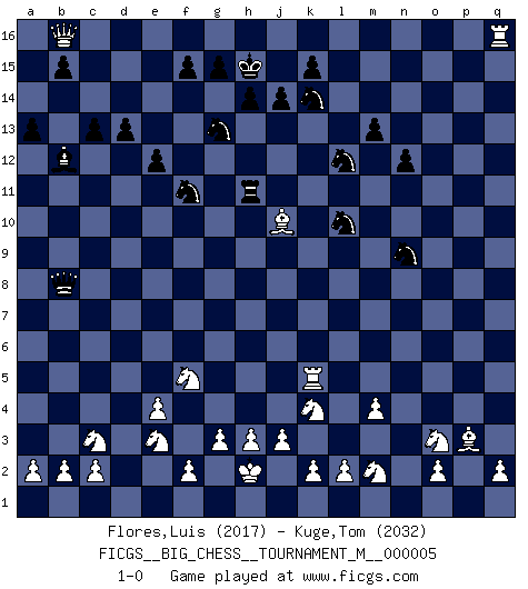 Last move : 1-0 2012 April 30 8:42:3 [Event "FICGS__BIG_CHESS__TOURNAMENT_M__000005"] [Site "FICGS"] [Date "2012.01.12"] [Round "1"] [White "Flores,Luis"] [Black "Kuge,Tom"] [Result "1-0"] [WhiteElo "2017"] [BlackElo "2032"] 1.j2-k4 h15-g13 2.m2-m4 m15-m13 3.e2-e4 j15-k13 4.h2-g4 d15-d13 5.d2-d4 n15-n13 6.n2-n4 p16-o14 7.p1-o3 l16-p12 8.l1-o4 e15-e13 9.c1-k8 b16-c14 10.b1-c3 f16-b12 11.f1-b5 k16-l14 12.o1-f9 l14-m12 13.h1-l4 o16-m14 14.f9-b13 b12-d14 15.m1-m3 c16-d15 16.e1-e3 a15-a14 17.b13-a12 g16-f14 18.l4-m5 h16-k14 19.e3-f3 k14-a5 20.a12-e8 a5-b4 21.a1-b1 b4-d4 22.b1-d1 d4-l11 23.m3-l3 l11-p11 24.o4-p3 d15-l8 25.k1-h2 m14-j11 26.q1-n1 q15-q13 27.n1-n3 d14-b12 28.l3-l7 m12-l10 29.k8-m10 o14-n12 30.m10-g5 k13-m12 31.n3-l3 l8-m9 32.g5-h4 j11-m8 33.l7-h7 m8-h4 34.h7-h4 q16-q14 35.d1-d9 m9-k7 36.m5-c5 e13-e12 37.f3-f7 k7-n4 38.c5-n15 m16-m15 39.e8-m15 n12-m14 40.n15-m16 j16-j15 41.m16-l15 p12-m15 42.b5-m15 m14-l12 43.m15-a4 p11-o11 44.l15-l13 j15-h15 45.l13-b4 n4-f11 46.d9-g9 f14-h13 47.g9-b9 a14-a13 48.f7-p7 e16-p16 49.b9-p9 p15-p13 50.p9-p13 q14-p14 51.p13-p14 p16-p14 52.p7-p14 o15-p14 53.b4-n15 h15-j15 54.n15-l13 h13-k14 55.a4-b3 o11-n11 56.g4-e3 n11-n2 57.g1-j2 c14-d12 58.l13-d6 c15-c13 59.h4-h5 n2-o1 60.h2-k1 o1-p2 61.h5-o5 p2-q3 62.d6-p6 f11-g12 63.o5-q5 q3-n6 64.p6-p14 n6-d6 65.j2-g3 g12-l8 66.l3-l8 a16-o16 67.k1-m2 d12-f11 68.p14-q13 o16-o9 69.q5-d5 d6-f6 70.d5-f5 f6-n6 71.l8-q8 n6-n11 72.f5-n5 n11-j11 73.q13-q11 o9-o11 74.q11-j4 j11-k12 75.j1-h2 n13-n12 76.q8-q16 o11-j11 77.j4-m7 j11-h11 78.n5-k5 k12-f8 79.g3-f5 m12-o11 80.m7-l7 o11-n9 81.l7-b16 j15-h15 82.b3-j10 f8-b8 83.g2-g3 1-0 Follow this game move after move (download)Chess is a foolish expedient for making idle people believe they are doing something very clever when they are only wasting their time. (George Bernard Shaw) Schach ist das Spiel, das die Verrückten gesund hält. (Albert Einstein) Juega la Apertura como un libro, el Juego Medio como un mago y los Finales como una máquina. (Spielmann) Les échecs sont un jeu par leur forme, un art par leur essence et une science par sa difficulté d'acquisition. Ils peuvent vous procurer autant de plaisir qu'un bon livre ou une belle musique, mais vous n'aurez une réelle joie que si vous arrivez à bien jouer. (Tigran Petrosian) A married woman is like a fish riding a bicycle. (Rodolfo d'Ettorre)