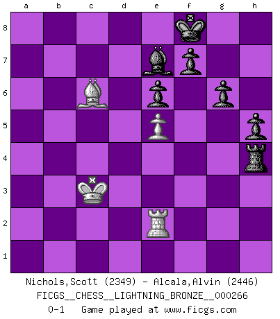 Last move : 0-1 2012 January 12 18:47:56 [Event "FICGS__CHESS__LIGHTNING_BRONZE__000266"] [Site "FICGS"] [Date "2012.01.12"] [Round "1"] [White "Nichols,Scott"] [Black "Alcala,Alvin"] [Result "0-1"] [WhiteElo "2349"] [BlackElo "2446"] 1.Nf3 c5 2.e4 d6 3.d4 cxd4 4.Nxd4 Nf6 5.Nc3 a6 6.Bg5 e6 7.f4 Nbd7 8.Qf3 Qc7 9.O-O-O b5 10.Bxf6 Nxf6 11.e5 Bb7 12.Qe3 dxe5 13.Ncxb5 Qb6 14.fxe5 Nd5 15.Qb3 O-O-O 16.Na3 Qxb3 17.Nxb3 g6 18.Re1 Nc3 19.bxc3 Bxa3+ 20.Kb1 Kd7 21.Bd3 Bxg2 22.Rhg1 Bc6 23.Rg4 Ke7 24.Bxa6 Ra8 25.Bd3 Rhc8 26.Rc4 Rab8 27.Ka1 h5 28.Rg1 Bd7 29.Rxc8 Rxc8 30.c4 Ke8 31.Rg2 Bc6 32.Re2 Rd8 33.h4 Be7 34.Rh2 Bb4 35.Kb2 Be1 36.Rh3 Bg2 37.Rh2 Bf3 38.Nd2 Ba8 39.Ne4 Ke7 40.a4 Bc6 41.Rh3 Ra8 42.Nc3 Ra5 43.Nb5 Rxa4 44.c3 Bg2 45.Rh2 Ba8 46.Kb3 Ra1 47.c5 Bd5+ 48.c4 Bc6 49.Nd4 Ba4+ 50.Kb2 Rd1 51.Rh3 Bf2 52.Kc3 Rc1+ 53.Kd2 Rg1 54.Nf3 Rd1+ 55.Kc3 Bxc5 56.Ng5 Bc6 57.Ne4 Ba7 58.c5 Bxe4 59.Bxe4 Bxc5 60.Kc2 Rd4 61.Re3 Kf8 62.Kc3 Ra4 63.Re2 Be7 64.Bc6 Rxh4 0-1 Reti Opening Queenside Castling by player White (move 9) Queenside Castling by player Black (move 15) Player Black won this chess game. Follow this game move after move (download)Pawn endings are to Chess what putting is to golf. (Cecil Purdy) Wenn es im Universum noch irgendwo intelligente Lebewesen gibt, dann kennen sie Go. (Emanuel Lasker) Jugadores de primera clase pierden en contra de jugadores de segunda clase porque los jugadores de segunda clase a veces juegan una partida de primer clase. (Siegbert Tarrasch) Il n'y a plus de joueurs du niveau de Jacob Murray dont la seule quête est le beau jeu, le plaisir de voir les pièces construire quelque chose. Sur 10 idées à la minute, 9 seront sans intérêt, la dernière s'avèrera géniale. (Christian Bauer) A specialist learns more and more about less and less until he knows everything about nothing. (Nicholas Murray Butler)