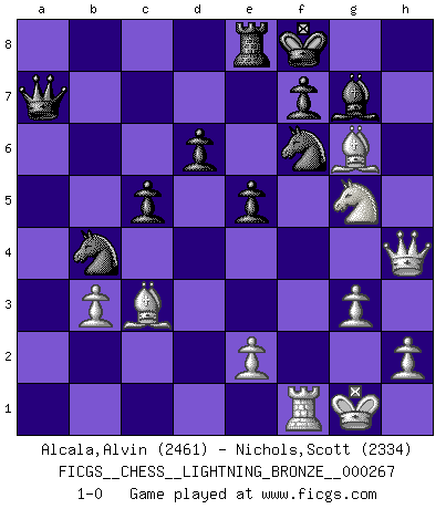 Last move : 1-0 2012 January 12 19:28:47 [Event "FICGS__CHESS__LIGHTNING_BRONZE__000267"] [Site "FICGS"] [Date "2012.01.12"] [Round "1"] [White "Alcala,Alvin"] [Black "Nichols,Scott"] [Result "1-0"] [WhiteElo "2461"] [BlackElo "2334"] 1.g3 h5 2.c4 h4 3.d4 hxg3 4.fxg3 Nf6 5.Nc3 c5 6.d5 d6 7.Nf3 g6 8.Bg2 Bg7 9.O-O Nbd7 10.Bd2 a6 11.Qc2 b5 12.cxb5 axb5 13.Nxb5 Nb6 14.Ng5 O-O 15.a4 Bf5 16.Rxf5 gxf5 17.Bh3 Nbxd5 18.Bxf5 Qb6 19.Qc4 Nb4 20.Rf1 Rxa4 21.Bc3 e5 22.b3 Ra7 23.Nxa7 Qxa7 24.Qh4 Re8 25.Bh7+ Kf8 26.Bg6 1-0 Lasker simul special Kingside Castling by player White (move 9) Kingside Castling by player Black (move 14) Player White won this chess game. Follow this game move after move (download)The battle for the ultimate truth will never be won. And that's why Chess is so fascinating. (Hans Kmoch) Um dein Spiel zu verbessern musst du zuallererst das Endspiel studieren, denn diese kann unabhängig studiert werden. Die Eröffnung und das Mittelspiel müssen immer in Bezug gesetzt werden zum Endspiel. (José Raúl Capablanca) El Ajedrez es imaginación. (David Bronstein) Si rien de grave n'est détecté lors de l'analyse d'une position, on joue alors le coup. Seconde règle de Blumenfeld. The only sure thing about luck is that it will change. (Wilson Mizner)