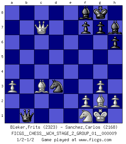 Last move : 1/2-1/2 2012 April 21 12:14:55 [Event "FICGS__CHESS__WCH_STAGE_2_GROUP_01__000009"] [Site "FICGS"] [Date "2012.01.12"] [Round "1"] [White "Bleker,Frits"] [Black "Sanchez,Carlos"] [Result "1/2-1/2"] [WhiteElo "2323"] [BlackElo "2168"] 1.d4 Nf6 2.c4 e6 3.g3 d5 4.Bg2 dxc4 5.Nf3 a6 6.O-O Nc6 7.e3 Bd7 8.Nc3 Bd6 9.Qe2 Rb8 10.Qxc4 O-O 11.a3 e5 12.b4 h6 13.Bb2 b5 14.Qd3 exd4 15.exd4 a5 16.d5 axb4 17.dxc6 bxc3 18.Qxc3 Bf5 19.Rad1 Re8 20.Rfe1 Rxe1+ 21.Nxe1 Qf8 22.Qc1 Ne4 23.Rd5 Bh7 24.Nc2 Qe7 25.Ne3 Qe6 26.Qd1 Bf8 27.Qd4 Re8 28.Rxb5 Qxc6 29.Re5 Rxe5 30.Qxe5 Qg6 31.Qxc7 Nc5 32.Nf1 Qb1 33.Bc3 Nd3 1/2-1/2 Catalan : Open, 5.Nf3 Kingside Castling by player White (move 6) Kingside Castling by player Black (move 10) This chess game ended in a draw. Follow this game move after move (download)The chessboard is the world, the pieces are the phenomena of the Universe, the rules of the game are what we call the laws of Nature and the player on the other side is hidden from us. (Thomas Huxley) Sehr viele beherrschen heutzutage das große Einmalseins des Schachspiels und kennen sogar dessen Logarithmentafeln auswendig - deshalb sollte man hin und wieder zu beweisen trachten, dass zwei mal zwei auch fünf sein kann. (Mikhail Nekhemyevich Tal) El Ajedrez es el arte del análisis. (Mikhail Botvinnik) A ce moment-là, je menaçais de comprendre la position ! (Clément L'Heureux) Programming can only do so much before it becomes too much. (Don Groves)