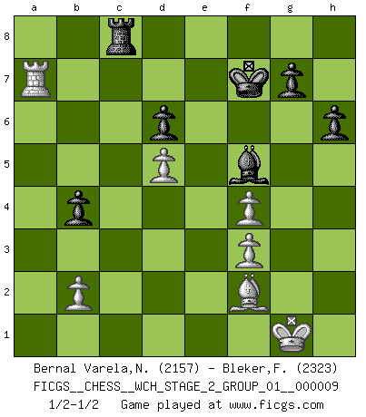 Last move : 1/2-1/2 2012 May 22 13:0:5 [Event "FICGS__CHESS__WCH_STAGE_2_GROUP_01__000009"] [Site "FICGS"] [Date "2012.01.12"] [Round "1"] [White "Bernal Varela,Nelson"] [Black "Bleker,Frits"] [Result "1/2-1/2"] [WhiteElo "2157"] [BlackElo "2323"] 1.e4 c5 2.Nf3 d6 3.d4 cxd4 4.Nxd4 Nf6 5.Nc3 a6 6.Bg5 e6 7.Be2 Be7 8.Qd3 O-O 9.O-O h6 10.Bd2 Nbd7 11.Qg3 Kh8 12.Rad1 Nc5 13.Bf3 Qc7 14.Be3 Re8 15.h3 Rb8 16.Nb3 Ncd7 17.a4 b6 18.Be2 Bb7 19.Nd2 Nc5 20.Bd3 Rec8 21.Rfe1 Nxd3 22.cxd3 Qd8 23.Ra1 Bc6 24.Nf3 Be8 25.Rec1 Nd7 26.Ra2 b5 27.axb5 axb5 28.Bd4 f6 29.Be3 Nc5 30.Ra7 Bf8 31.d4 Nd3 32.Rb1 b4 33.Ne2 Rc7 34.d5 exd5 35.exd5 Rxa7 36.Bxa7 Ra8 37.Bd4 Qe7 38.Ne1 Nc5 39.Nf4 Qe4 40.Rd1 Ba4 41.f3 Qf5 42.Ra1 Nb3 43.Rd1 Kg8 44.Qg4 Qxg4 45.hxg4 Kf7 46.Bf2 Be7 47.Nc2 f5 48.gxf5 Na5 49.Rc1 Bg5 50.g3 Bxf4 51.gxf4 Rc8 52.Ra1 Bxc2 53.Rxa5 Bxf5 54.Ra7+ 1/2-1/2 Sicilian : Najdorf, 6...e6 Kingside Castling by player Black (move 8) Kingside Castling by player White (move 9) This chess game ended in a draw. Follow this game move after move (download)After a bad opening, there is hope for the middle game. After a bad middle game, there is hope for the endgame. But once you are in the endgame, the moment of truth has arrived. (Edmar Mednis) Die westlichen Werte sind eine Sprache, welche die Putin-Administration nicht versteht. (Garry Kasparov) El jugador táctico sabe que hacer cuando hay algo que hacer; mientras que el estratega sabe que hacer cuando no hay nada que hacer. (Gerald Abrahams) Mais n'est-ce pas déjà le limiter injurieusement que d'appeler les échecs un jeu? N'est-ce pas aussi une science, un art, ou quelque chose qui, comme le cercueil de Mahomet entre ciel et terre, est suspendu entre l'un et l'autre, et qui réunit un nombre incroyable de contraires ? (Stefan Zweig) When you don't know what to do, walk fast and look worried. (Anonymous)
