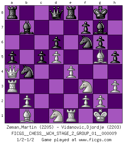 Last move : 1/2-1/2 2012 March 25 23:16:38 [Event "FICGS__CHESS__WCH_STAGE_2_GROUP_01__000009"] [Site "FICGS"] [Date "2012.01.12"] [Round "1"] [White "Zeman,Martin"] [Black "Vidanovic,Djordje"] [Result "1/2-1/2"] [WhiteElo "2205"] [BlackElo "2203"] 1.e4 e5 2.Nf3 Nc6 3.Bb5 a6 4.Ba4 Nf6 5.O-O Be7 6.Re1 b5 7.Bb3 d6 8.c3 O-O 9.h3 Re8 10.d4 Bb7 11.Nbd2 Bf8 12.a4 h6 13.Bc2 exd4 14.cxd4 Nb4 15.Bb1 c5 16.d5 g6 17.Ra3 Bg7 18.Nf1 Nd7 19.Ne3 h5 20.Qb3 Nf6 21.Nd1 bxa4 22.Qxa4 a5 23.Bg5 1/2-1/2 Ruy Lopez : Closed Kingside Castling by player White (move 5) Kingside Castling by player Black (move 8) This chess game ended in a draw. Follow this game move after move (download)In the perfect Chess combination as in a first-rate short story, the whole plot and counter-plot should lead up to a striking finale, the interest not being allayed until the very last moment. (Yates and Winter) Ich hatte meine größten Erfolge, als ich 47 Jahre alt war. Kasparow war noch nicht mal 42 und hat das Schach schon im Stich gelassen. (Viktor Kortschnoi) A través de las casillas del tablero, los Indios explican el movimiento del tiempo y la edad, las influencias mas altas que controlan el mundo y los lazos que vinculan al Ajedrez con el alma humana. (Al-Masudi) Les ravages du H expliquent la différence de niveau entre Tal et Thal [Abergel]. The difference between perseverance and obstinacy is that one comes from a strong will, and the other from a strong won't. (Henry Ward Beecher)