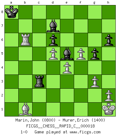 Last move : 1-0 2007 May 5 19:56:47 [Event "FICGS__CHESS__RAPID_C__000018"] [Site "FICGS"] [Date "2007.01.15"] [Round "1"] [White "Marin,John"] [Black "Murer,Erich"] [Result "1-0"] [WhiteElo "0800"] [BlackElo "1400"] 1.e4 e5 2.Nc3 Nf6 3.Nf3 Nc6 4.Bb5 Nd4 5.Bc4 Bc5 6.Nxe5 Qe7 7.Nxf7 Rf8 8.O-O b5 9.Nxb5 Nxb5 10.Bxb5 Qxf7 11.d4 Be7 12.Qe2 Bb7 13.Bd3 O-O-O 14.c4 Nh5 15.f4 g5 16.f5 d6 17.d5 Bf6 18.Kh1 Rfe8 19.Rb1 Kb8 20.b4 Re7 21.Bc2 Nf4 22.Qf3 c6 23.Qf2 cxd5 24.cxd5 Rc7 25.Be3 Ka8 26.Rb3 Rdc8 27.Bb1 Rc3 28.Rxc3 Rxc3 29.Bd2 Rc8 30.a4 Be5 31.b5 Qh5 32.a5 Rc5 33.Bxf4 Bxf4 34.g3 Be5 35.Bd3 Bc8 36.Rb1 Rc3 37.Be2 Qe8 38.Bf3 Rc5 39.Qe2 Bd7 40.b6 Rxa5 41.bxa7 Rxa7 42.Qe3 h6 43.Be2 Qc8 44.Bf1 Qc7 45.Rc1 Qb7 46.Qd3 Qb2 47.Rb1 Qd4 48.Qc2 Qc3 49.Qxc3 Bxc3 50.Rb6 Be5 51.Ba6 Rc7 52.Bd3 Rc3 53.Bb1 1-0 This chess game has been lost on time (started : 2007.01.15 8:31:35) Vienna : Falkbeer variation Kingside Castling by player White (move 8) Queenside Castling by player Black (move 13) Player White won this chess game. Follow this game move after move (download)I like to say that Bobby Fischer was the greatest player ever. But what made Fischer a genius was his ability to blend an American freshness and pragmatism with Russian ideas about strategy. (Bruce Pandolfini) Gott hat gewollt, dass ich Champion werde. (Surab Azmajparaschvili) Alekhine es un poeta que crea un trabajo de arte de algo que raramente inspiraría a otra persona a mandar una tarjeta postal. (Max Euwe) Le moment que je préfère le plus dans une rencontre, c'est celui où je sens que la personnalité de l'adversaire se brise. (Robert Fischer) A government big enough to give you everything you want is strong enough to take everything you have. (Thomas Jefferson)