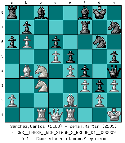 Last move : 0-1 2012 May 28 23:42:37 [Event "FICGS__CHESS__WCH_STAGE_2_GROUP_01__000009"] [Site "FICGS"] [Date "2012.01.12"] [Round "1"] [White "Sanchez,Carlos"] [Black "Zeman,Martin"] [Result "0-1"] [WhiteElo "2168"] [BlackElo "2205"] 1.d4 Nf6 2.c4 g6 3.Nc3 Bg7 4.e4 d6 5.Nf3 O-O 6.Be2 e5 7.O-O Nc6 8.d5 Ne7 9.b4 Nd7 10.Nd2 f5 11.c5 Nf6 12.f3 f4 13.Nc4 g5 14.cxd6 cxd6 15.b5 Ng6 16.Ba3 Ne8 17.b6 a6 18.Rc1 h5 19.Rf2 Rf7 20.Bb4 Bf8 21.Rf1 Nf6 22.Kh1 g4 23.Rg1 g3 24.h3 Nh7 25.Re1 Qh4 0-1 King's Indian : Orthodox, Aronin-Taimanov variation (Yugoslav attack / Mar del Plata variation) Kingside Castling by player Black (move 5) Kingside Castling by player White (move 7) Player Black won this chess game. Follow this game move after move (download)Fischer wanted to give the Russians a taste of their own medicine. (Larry Evans) Wenn du gegen Bobby spielst, ist es keine Frage von gewinnen oder verlieren. Es ist eine Frage des Überlebens. (Boris Vassilievich Spassky) Existen dos clases de sacrificios: los correctos y los míos. (Mikhail Tal) Pour se monter efficace, un Cavalier a besoin d'avant-postes ! Les Cavaliers font les meilleurs bloqueurs de pions passés. Employ the attack like tactic of defense. (Chinese proverb)