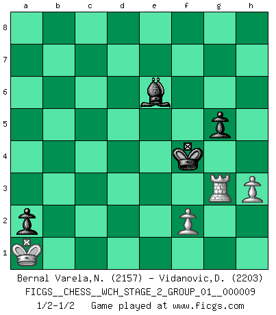 Last move : 1/2-1/2 2012 May 19 18:8:44 [Event "FICGS__CHESS__WCH_STAGE_2_GROUP_01__000009"] [Site "FICGS"] [Date "2012.01.12"] [Round "1"] [White "Bernal Varela,Nelson"] [Black "Vidanovic,Djordje"] [Result "1/2-1/2"] [WhiteElo "2157"] [BlackElo "2203"] 1.e4 e5 2.Nf3 Nc6 3.Bb5 a6 4.Ba4 Nf6 5.O-O Be7 6.Nc3 b5 7.Bb3 d6 8.Nd5 O-O 9.Re1 Na5 10.Nxe7+ Qxe7 11.d3 h6 12.Bd2 Nxb3 13.axb3 c5 14.h3 Re8 15.Nh2 b4 16.Nf1 a5 17.Ng3 Qc7 18.Qf3 Kh7 19.Qe3 Ra6 20.Kh2 Bb7 21.Nf5 d5 22.Qg3 g6 23.Nxh6 dxe4 24.dxe4 Nxe4 25.Rxe4 Bxe4 26.Qh4 Bxc2 27.Kg1 c4 28.Ng4 Kg8 29.Bg5 R8e6 30.Bf6 Rxf6 31.Nxf6+ Rxf6 32.Qxf6 Bxb3 33.Re1 c3 34.bxc3 bxc3 35.Qxe5 Qxe5 36.Rxe5 a4 37.Re1 Kg7 38.Rc1 c2 39.Kf1 f5 40.Ke2 Kf6 41.Ke3 Ke5 42.g3 Ke6 43.Re1 Kf6 44.Kd2 f4 45.gxf4 Kf5 46.Rg1 a3 47.Kc3 Bf7 48.Kxc2 a2 49.Kb2 Kxf4 50.Ka1 g5 51.Rg4+ Kf5 52.Rg1 Be6 53.Re1 Kf6 54.Re4 Bf5 55.Re1 Be6 56.Re3 Kf5 57.Kb2 Bd5 58.Rd3 Ke4 59.Rg3 Kf4 60.Rg4+ Kf5 61.Ka1 Be6 62.Rg3 Bd5 63.Rg1 Kf6 64.Rc1 Ke5 65.Re1+ Kf4 66.Rg1 Be6 67.Rg3 1/2-1/2 Ruy Lopez : Closed defense Kingside Castling by player White (move 5) Kingside Castling by player Black (move 8) 10 pieces endgame at move 45 : White KRPPP , Black KBPPP WHITE : King + 1 Rook 3 Pawns BLACK : King + 1 Bishop 3 Pawns 9 pieces endgame at move 48 : White KRPPP , Black KBPP WHITE : King + 1 Rook 3 Pawns BLACK : King + 1 Bishop 2 Pawns 8 pieces endgame at move 49 : White KRPP , Black KBPP WHITE : King + 1 Rook 2 Pawns BLACK : King + 1 Bishop 2 Pawns This chess game ended in a draw. Follow this game move after move (download)Many have become Chess Masters, no one has become the Master of Chess. (Siegbert Tarrasch) Der vorletzte Fehler gewinnt. (Savielly Grigorievitsch Tartakower) Haz el enroque temprano y seguido. (Rob Sillars) Le temps de noter son nom sur la feuille de partie, j'étais déjà en zeitnot ! D'un modeste amateur apparié lors de la première ronde d'un open contre le grand-maître Azmaïparashvili. In God we trust, all others we virus scan. (Anonymous)