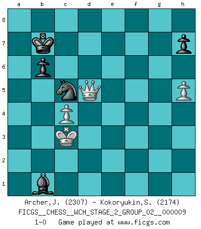 Last move : 1-0 2012 August 1 22:37:18 [Event "FICGS__CHESS__WCH_STAGE_2_GROUP_02__000009"] [Site "FICGS"] [Date "2012.01.12"] [Round "1"] [White "Archer,J. Robert"] [Black "Kokoryukin,Sergey"] [Result "1-0"] [WhiteElo "2307"] [BlackElo "2174"] 1.d4 d5 2.c4 e6 3.Nc3 c6 4.e4 dxe4 5.Nxe4 Bb4+ 6.Bd2 Qxd4 7.Bxb4 Qxe4+ 8.Be2 Na6 9.Ba5 b6 10.Qd6 Bd7 11.Bc3 f6 12.Nf3 O-O-O 13.Nd2 Qxg2 14.Bf3 Qh3 15.Qa3 Kb7 16.Rg1 e5 17.Rg3 Qe6 18.Rxg7 Nc5 19.O-O-O Nh6 20.Ne4 Nxe4 21.Re7 Nc5 22.Rxe6 Bxe6 23.Bb4 Rxd1+ 24.Bxd1 Nd7 25.Qd3 a5 26.Ba3 Nf7 27.Bh5 Ng5 28.h4 Nh3 29.Qd6 Nf4 30.Qe7 c5 31.Be8 Kc7 32.b3 Rxe8 33.Qxe8 a4 34.Kd2 axb3 35.axb3 Bf5 36.Qe7 Kc6 37.b4 Nd3 38.f3 cxb4 39.Bxb4 Nxb4 40.Qxb4 Nc5 41.Qb5+ Kb7 42.h5 Kc7 43.Qe8 Nd7 44.Qe7 Kc6 45.Ke3 Kc7 46.f4 Bc2 47.fxe5 fxe5 48.Kd2 Bb1 49.Kc3 Kc8 50.Qh4 Nc5 51.Qh2 Kc7 52.Qxe5+ Kb7 53.Qd5+ 1-0 QGD : Semi-Slav, Marshall gambit Queenside Castling by player Black (move 12) Queenside Castling by player White (move 19) 10 pieces endgame at move 47 : White KQPP , Black KBNPPP WHITE : King + 1 Queen 2 Pawns BLACK : King + 1 Bishop 1 Knight 3 Pawns 9 pieces endgame at move 52 : White KQPP , Black KBNPP WHITE : King + 1 Queen 2 Pawns BLACK : King + 1 Bishop 1 Knight 2 Pawns Player White won this chess game. Follow this game move after move (download)I give 98 percent of my mental energy to Chess. Others give only 2 percent. (Bobby Fischer) Gegen einen Schachcomputer zu verlieren ist wie Löcher in den Strümpfen zuhaben. Es ist nicht peinlich, solange man der einzige ist der es weiß. (Anonymous) El arma más poderosa en el Ajedrez, es tener la próxima movida. (David Bronstein) On peut tirer plus d'utilité d'une partie perdue que de 100 parties gagnées. (Capablanca) Methinks King Thibault should dub Marius Zubac a knight of the square board... I mean table, henceforth addressing him as Sir Marius, and bestow on him a suitable land from the kingdom of FICGS & marry him off to a worthy, fair maiden, lest he slice our heads with his mighty sword in his wrath. (Dinesh De Silva)