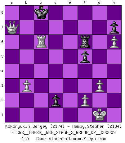 Last move : 1-0 2012 July 30 7:53:20 [Event "FICGS__CHESS__WCH_STAGE_2_GROUP_02__000009"] [Site "FICGS"] [Date "2012.01.12"] [Round "1"] [White "Kokoryukin,Sergey"] [Black "Hamby,Stephen"] [Result "1-0"] [WhiteElo "2174"] [BlackElo "2134"] 1.d4 Nf6 2.c4 e6 3.Nc3 Bb4 4.Nf3 d5 5.Bg5 dxc4 6.e4 c5 7.Bxc4 cxd4 8.Nxd4 Bxc3+ 9.bxc3 Qa5 10.Bb5+ Nbd7 11.Bxf6 Qxc3+ 12.Kf1 gxf6 13.h4 Qa5 14.Rh3 a6 15.Be2 Nc5 16.Nb3 Nxb3 17.axb3 Qe5 18.Rd3 O-O 19.Qc1 Kh8 20.Rb1 f5 21.exf5 Qxf5 22.Qc7 e5 23.Re1 Be6 24.Rf3 Qh5 25.g3 Bh3+ 26.Kg1 Bg4 27.Re3 f6 28.Qxb7 Bxe2 29.R1xe2 Qf7 30.Qf3 Qe6 31.h5 Rac8 32.Re4 Rc1+ 33.Kg2 Qc6 34.R2e3 Rf7 35.Rd3 Kg7 36.Kh2 Kf8 37.Rd8+ Ke7 38.Rb8 Kd6 39.Qf5 a5 40.h6 Qd7 41.Rd4+ exd4 42.Qf4+ Ke6 43.Qxc1 Qc7 44.Re8+ Kd7 45.Qe1 Qb6 46.Re4 f5 47.Re5 Qc6 48.Kg1 d3 49.Qxa5 Rf6 50.Qa7+ Kc8 51.Rc5 d2 52.Rxc6+ 1-0 Nimzo-Indian : Three knights variation Kingside Castling by player Black (move 18) Player White won this chess game. Follow this game move after move (download)The only thing Chess players have in common is Chess. (Lodewijk Prins) Es ist nicht das erste mal, dass sich die FIDE dem Arabischen Geld gebeugt hat (über die FIDE WM 2004 in Lybien). (Larry Evans) No es tiempo de jugar al Ajedrez cuando la casa esta en llamas. (Proverbio Italiano) Les Echecs ne sont pas pour les âmes timides. Ils requièrent un homme entier, qui ne s'arrête pas aveuglément à ce qui a été déjà établi, mais qui tente individuellement de sonder les profondeurs du jeu. (W. Steinitz) At work, the authority of a person is inversely proportional to the number of pens that person is carrying. (Dan Rotaru)