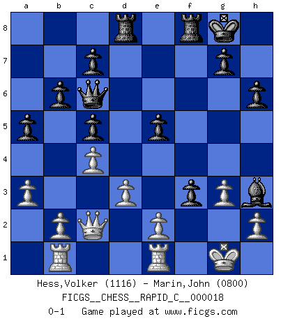 Last move : 0-1 2007 February 9 18:9:28 [Event "FICGS__CHESS__RAPID_C__000018"] [Site "FICGS"] [Date "2007.01.15"] [Round "1"] [White "Hess,Volker"] [Black "Marin,John"] [Result "0-1"] [WhiteElo "1116"] [BlackElo "0800"] 1.c4 e5 2.Nc3 Nf6 3.Nf3 Nc6 4.g3 Bc5 5.Bg2 d6 6.O-O O-O 7.d3 Bg4 8.Bg5 h6 9.Bxf6 Qxf6 10.Rb1 a5 11.Ne4 Qe6 12.Nxc5 dxc5 13.a3 Rad8 14.Nd2 b6 15.Bxc6 Qxc6 16.Ne4 Bh3 17.Re1 f5 18.f3 fxe4 19.Qc2 exf3 0-1 English Opening Kingside Castling by player White (move 6) Kingside Castling by player Black (move 6) Player Black won this chess game. Follow this game move after move (download)If your opponent cannot do anything active, then don't rush the position; instead you should let him sit there, suffer, and beg you for a draw. (Jeremy Silman) Ich bin der einzige Schachspieler, der sich während der Vorbereitungen zum Turnier verletzt hat. (Woody Allen) Una clavada es mas poderosa que una espada. (Fred Reinfeld) Karpov est une pièce de musée. (Garry Kasparov) The greatest con, that he ever pulled... was making you believe... that he is you. (Revolver, movie)