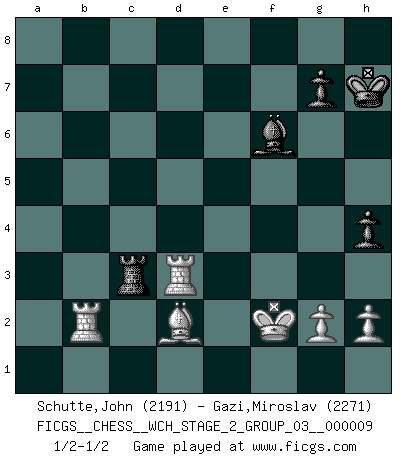 Last move : 1/2-1/2 2012 May 4 18:32:29 [Event "FICGS__CHESS__WCH_STAGE_2_GROUP_03__000009"] [Site "FICGS"] [Date "2012.01.12"] [Round "1"] [White "Schutte,John"] [Black "Gazi,Miroslav"] [Result "1/2-1/2"] [WhiteElo "2191"] [BlackElo "2271"] 1.e4 c5 2.Nf3 d6 3.d4 cxd4 4.Nxd4 Nf6 5.Nc3 a6 6.Bg5 e6 7.Qf3 Nbd7 8.O-O-O h6 9.Be3 Qc7 10.Qg3 b5 11.a3 Rb8 12.Bd3 Ne5 13.Rhe1 Nc4 14.f4 h5 15.Bg1 h4 16.Qf3 Be7 17.e5 dxe5 18.Qc6+ Qd7 19.Qxd7+ Bxd7 20.fxe5 Nh7 21.a4 O-O 22.Ndxb5 Bg5+ 23.Kb1 Nd2+ 24.Ka1 axb5 25.Be3 b4 26.Bxh7+ Kxh7 27.Rxd2 bxc3 28.Rxd7 cxb2+ 29.Kb1 f6 30.exf6 Bxf6 31.Bd2 Rfc8 32.Rd3 Rc4 33.Ra3 Rd8 34.Re2 Be7 35.Rd3 Rdc8 36.Rxe6 Bf6 37.c3 Rxa4 38.Kxb2 Rb8+ 39.Kc2 Ra2+ 40.Kd1 Rb1+ 41.Ke2 Rg1 42.Kf2 Rc1 43.Ra6 Rb2 44.Rb6 Rxc3 45.Rxb2 1/2-1/2 Sicilian : Najdorf, 6...e6 Queenside Castling by player White (move 8) Kingside Castling by player Black (move 21) This chess game ended in a draw. Follow this game move after move (download)We must make sure that Chess will not be like a dead language, very interesting, but for a very small group. (Sytze Faber) Frage: Was machen Sie mit den Preisen? Anwort: Ich habe Angst, dass meine Freundin davon neue Kleider kauft. (Loek van Wely) Después de una mala apertura, hay una esperanza en el juego medio. Pero una vez que estas en finales, el momento de la verdad ha llegado. (Edmar Mednis) Mais n'est-ce pas déjà le limiter injurieusement que d'appeler les échecs un jeu? N'est-ce pas aussi une science, un art, ou quelque chose qui, comme le cercueil de Mahomet entre ciel et terre, est suspendu entre l'un et l'autre, et qui réunit un nombre incroyable de contraires ? (Stefan Zweig) If you have any trouble condescending, find a Unix user to show you how it's done. (Scott Adams)