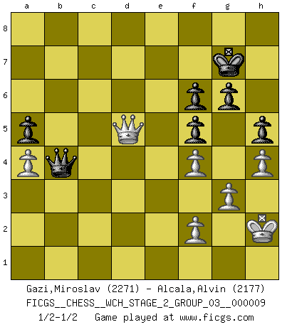 Last move : 1/2-1/2 2012 October 11 17:55:51 [Event "FICGS__CHESS__WCH_STAGE_2_GROUP_03__000009"] [Site "FICGS"] [Date "2012.01.12"] [Round "1"] [White "Gazi,Miroslav"] [Black "Alcala,Alvin"] [Result "1/2-1/2"] [WhiteElo "2271"] [BlackElo "2177"] 1.d4 Nf6 2.Bg5 d5 3.Bxf6 exf6 4.e3 Bd6 5.g3 O-O 6.Nd2 c6 7.Bg2 Qb6 8.b3 Ba3 9.Ne2 Bf5 10.O-O Qa6 11.Nf4 Bb2 12.Rb1 Bc3 13.Ne2 Bb4 14.a3 Be7 15.Ra1 Nd7 16.Nf4 Rfd8 17.Re1 Nf8 18.Bf1 Qb6 19.c4 dxc4 20.Nxc4 Qc7 21.b4 Ne6 22.Bd3 Bxd3 23.Nxd3 Qd7 24.Qc2 b6 25.Red1 c5 26.dxc5 Qc6 27.Nf4 Nxf4 28.exf4 bxc5 29.Ne3 a6 30.Rac1 Rxd1+ 31.Qxd1 Bf8 32.a4 Rc8 33.Rc4 f5 34.bxc5 g6 35.h4 h5 36.Kh2 Bxc5 37.Qd5 Kf8 38.Qe5 f6 39.Qd5 a5 40.Qd2 Qb6 41.Qc1 Kg7 42.Qc2 Qc6 43.Qb3 Kh6 44.Qc3 Qb6 45.Nd5 Qd6 46.Ne3 Qb6 47.Qc2 Qc6 48.Rc3 Rc7 49.Qb3 Kg7 50.Qc4 Qd6 51.Nd5 Rc8 52.Kh3 Qe6 53.Rc2 Qd7 54.Kh2 Qe6 55.Qb3 Bb4 56.Rxc8 Qxc8 57.Nxb4 Qb7 58.Qd5 Qxb4 1/2-1/2 Trompowsky attack (Ruth, Opovcensky Opening) Kingside Castling by player Black (move 5) Kingside Castling by player White (move 10) This chess game ended in a draw. Follow this game move after move (download)Whoever sees no other aim in the game than that of giving checkmate to one's opponent will never become a good Chess player. (Euwe) Wenn ich Weiß habe gewinne ich weil ich Weiß habe, wenn ich Schwarz habe gewinne ich weil ich Bogoljubov bin. (Efim Bogoljubov) Creo que una cierta cantidad de temperamento es esperada de los genios del Ajedrez. (Ron Gross) Que feriez-vous si vous étiez en train de jouer aux échecs et que la fin du monde arrive ? Je continuerais à jouer. (Saint Borromée) To steal ideas from one person is plagiarism. To steal from many is research. (Unknown)