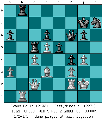 Last move : 1/2-1/2 2012 March 18 15:14:10 [Event "FICGS__CHESS__WCH_STAGE_2_GROUP_03__000009"] [Site "FICGS"] [Date "2012.01.12"] [Round "1"] [White "Evans,David"] [Black "Gazi,Miroslav"] [Result "1/2-1/2"] [WhiteElo "2132"] [BlackElo "2271"] 1.e4 c5 2.Nf3 d6 3.d4 cxd4 4.Nxd4 Nf6 5.Nc3 a6 6.f3 e5 7.Nb3 Be6 8.Be3 h5 9.Qd2 Nbd7 10.Nd5 Bxd5 11.exd5 Qc7 12.c4 b6 13.Bd3 g6 14.O-O Bg7 15.Qf2 O-O 16.h3 Rfe8 17.Rac1 Rac8 18.Bb1 Nc5 19.Nxc5 bxc5 20.Bc2 Rb8 21.b3 Nh7 22.Bd2 Bf6 23.a3 Bg5 24.Bxg5 Nxg5 25.Qd2 Nh7 26.Rce1 f5 27.g4 hxg4 28.hxg4 Qg7 29.b4 Rec8 30.Bd3 Qf6 31.Kg2 Rc7 32.Rf2 f4 33.bxc5 Rxc5 34.Qc2 Kg7 35.Rb1 1/2-1/2 Sicilian : Najdorf Kingside Castling by player White (move 14) Kingside Castling by player Black (move 15) This chess game ended in a draw. Follow this game move after move (download)Avoid the crowd. Do your own thinking independently. Be the Chess player, not the Chess piece. (Ralph Charell) Im Wettkampf zwischen starken Meistern kommen Fehler sehr selten vor, deshalb ist es mit bloßem Warten nicht getan. (José Raúl Capablanca) Tu sabes, camarada Pachman, no disfruto el ser un Ministro, preferería jugar al Ajedrez como tu. (Che Guevara) Demandez au pauvre Cg1 ce qu'il en pense. Eduard Gufeld à propos de la variante Saemisch de l'Est-Indienne. Winning isn't everything... but losing is nothing. (Mednis)
