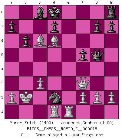 Last move : 0-1 2007 April 12 16:51:35 [Event "FICGS__CHESS__RAPID_C__000018"] [Site "FICGS"] [Date "2007.01.15"] [Round "1"] [White "Murer,Erich"] [Black "Woodcock,Graham"] [Result "0-1"] [WhiteElo "1400"] [BlackElo "1400"] 1.e4 e5 2.Nf3 Bc5 3.Nxe5 Qf6 4.d4 b6 5.Bc4 Nc6 6.Nxc6 Qxc6 7.Nc3 Bb4 8.Bd5 Bxc3+ 9.bxc3 Qxc3+ 10.Bd2 Qxd4 11.c3 Qe5 12.Qf3 Nf6 13.Bf4 Qe7 14.Bxa8 c6 15.O-O-O Nxe4 16.Rhe1 f5 17.Bd6 Qg5+ 18.Kb2 Kd8 19.Bxc6 Nd2 0-1 This chess game has been lost on time (started : 2007.01.15 8:31:35) King's knight Opening Queenside Castling by player White (move 15) Player Black won this chess game. Follow this game move after move (download)When you don't know what to play, wait for an idea to come into your opponent's mind. You may be sure that idea will be wrong. (Siegbert Tarrasch) Du kannst im Schach nur gut werden, wenn du das Spiel liebst. (Robert James Fischer) Hasta este punto, las blancas han seguido un análisis bien conocido. Pero ahora el hace un error fatal: empieza a usar su propia cabeza. (Siegbert Tarrasch) Le pion, dans sa simplicité, marche droit devant lui, mais lorsqu'il prend, il le fait obliquement? Ainsi l'homme, tant qu'il reste pauvre, marche dans la droiture et vit honnêtement, mais lorsqu'il recherche les honneurs, il flatte, se parjure et, par les voies obliques, cherche une position supérieure sur l'échiquier du monde. (Jean de Galles) I find your interest interesting. (Gregory House, House M.D.)