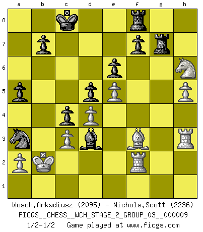 Last move : 1/2-1/2 2012 February 3 0:49:53 [Event "FICGS__CHESS__WCH_STAGE_2_GROUP_03__000009"] [Site "FICGS"] [Date "2012.01.12"] [Round "1"] [White "Wosch,Arkadiusz"] [Black "Nichols,Scott"] [Result "1/2-1/2"] [WhiteElo "2095"] [BlackElo "2236"] 1.e4 e6 2.d4 d5 3.Nc3 Nf6 4.Bg5 Bb4 5.e5 h6 6.Bd2 Bxc3 7.bxc3 Ne4 8.Qg4 g6 9.Bd3 Nxd2 10.Kxd2 c5 11.h4 c4 12.Be2 Nc6 13.Qf4 Qe7 14.Nf3 Bd7 15.Nh2 O-O-O 16.Ng4 Rdf8 17.h5 g5 18.Qe3 Qa3 19.f4 gxf4 20.Qxf4 a5 21.Rab1 Na7 22.Rh3 Ba4 23.Qf1 Rh7 24.Qc1 Nb5 25.Qxa3 Nxa3 26.Rf1 Bxc2 27.Kc1 Rg7 28.Nxh6 Rxg2 29.Bf3 Rg7 30.Kb2 Bd3 31.Rf2 1/2-1/2 French : MacCutcheon, Lasker variation Queenside Castling by player Black (move 15) This chess game ended in a draw. Follow this game move after move (download)It is the aim of the modern school, not to treat every position according to one general law, but according to the principle inherent in the position. (Richard Reti) Im Leben werden Partien nie so unstrittig gewonnen wie im Spiel (Emanuel Lasker) El Ajedrez es un terrible juego. Si no controlas el centro, tu oponente tiene una posición mas holgada. Si tienes control del centro, ¡entonces realmente tu tienes algo de que preocuparte!. (Siegbert Tarrasch) Psychologiquement, tu dois avoir confiance en toi même, mais cette confiance doit être basée sur des faits. (Robert Fischer) I can't decide which is riskier; taking crazy risks, or taking advice on crazy risks from a crazy risk taker. (Gregory House in House M.D.)