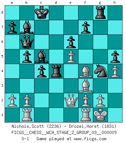 Last move : 0-1 2012 March 18 14:54:38 [Event "FICGS__CHESS__WCH_STAGE_2_GROUP_03__000009"] [Site "FICGS"] [Date "2012.01.12"] [Round "1"] [White "Nichols,Scott"] [Black "Drozel,Horst"] [Result "0-1"] [WhiteElo "2236"] [BlackElo "1831"] 1.Nf3 d5 2.d4 Nf6 3.c4 c6 4.Nc3 e6 5.Bg5 h6 6.Bh4 dxc4 7.e4 g5 8.Bg3 b5 9.Be2 Bb7 10.h4 g4 11.Ne5 Nbd7 12.Nxd7 Qxd7 13.Be5 Qe7 14.Bxg4 Rg8 15.Bf3 O-O-O 16.Bh2 h5 17.e5 Ng4 18.Bf4 Qb4 19.Rb1 Qa5 20.O-O Qb6 21.Ne4 Rxd4 22.Qe2 c5 23.Nxc5 Bxc5 0-1 Reti Opening Queenside Castling by player Black (move 15) Kingside Castling by player White (move 20) Player Black won this chess game. Follow this game move after move (download)We don't really know how the game was invented, though there are suspicions. As soon as we discover the culprits, we'll let you know. (Bruce Pandolfini) Die Jungen erwarten, dass Opa einfach umfällt. Dann aber kann Opa fünf Stunden lang Schach spielen und die jungen Gegner an die Wand drücken. (Viktor Kortschnoi) Yo adoro todas la posiciones. Denme una partida posicional difícil, y la jugaré. Pero posiciones totalmente ganadas, no las tolero. (Hein Donner) Il vaut toujours mieux jouer un plan faux de façon logique que de n'avoir pas de plan du tout. (Victor Kortchnoï) Imagination is more important than knowledge. Knowledge is limited. Imagination encircles the world. (Albert Einstein)