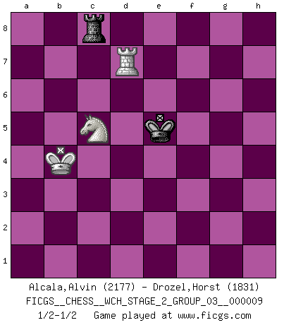 Last move : 1/2-1/2 2012 October 1 9:59:15 [Event "FICGS__CHESS__WCH_STAGE_2_GROUP_03__000009"] [Site "FICGS"] [Date "2012.01.12"] [Round "1"] [White "Alcala,Alvin"] [Black "Drozel,Horst"] [Result "1/2-1/2"] [WhiteElo "2177"] [BlackElo "1831"] 1.e4 c5 2.Nf3 d6 3.d4 cxd4 4.Nxd4 Nf6 5.Nc3 a6 6.f3 e5 7.Nb3 Be6 8.Be3 Be7 9.Qd2 O-O 10.O-O-O Nbd7 11.g4 b5 12.a3 Nb6 13.g5 Nh5 14.Na5 Rc8 15.Kb1 g6 16.h4 Ng3 17.Rh2 Nxf1 18.Rxf1 Na4 19.Nxa4 bxa4 20.Rd1 Qc7 21.h5 d5 22.exd5 Bxd5 23.hxg6 Be6 24.Rdh1 Rfd8 25.Qf2 Bxa3 26.gxh7+ Kh8 27.g6 fxg6 28.Bg5 Be7 29.Qh4 Bxg5 30.Qxg5 Rf8 31.Qxg6 Bf5 32.Qg5 Bxc2+ 33.Ka1 Qd8 34.Qg3 a3 35.Qxe5+ Qf6 36.Qxf6+ Rxf6 37.b3 Rxf3 38.Ka2 Be4 39.Rd1 Rc2+ 40.Rxc2 Bxc2 41.Rd6 Bd3 42.Nb7 Bxh7 43.Rxa6 Bg8 44.Nc5 Bxb3+ 45.Nxb3 Kg7 46.Kxa3 Kf7 47.Rd6 Rf6 48.Rd7+ Kg6 49.Nd4 Rb6 50.Nb3 Kf6 51.Kb2 Ke5 52.Kc3 Rc6+ 53.Kb4 Rc8 54.Nc5 1/2-1/2 Sicilian : Najdorf Kingside Castling by player Black (move 9) Queenside Castling by player White (move 10) 10 pieces endgame at move 40 : White KRNPP , Black KRBPP WHITE : King + 1 Rook 1 Knight 2 Pawns BLACK : King + 1 Rook 1 Bishop 2 Pawns 9 pieces endgame at move 42 : White KRNP , Black KRBPP WHITE : King + 1 Rook 1 Knight 1 Pawn BLACK : King + 1 Rook 1 Bishop 2 Pawns 8 pieces endgame at move 43 : White KRNP , Black KRBP WHITE : King + 1 Rook 1 Knight 1 Pawn BLACK : King + 1 Rook 1 Bishop 1 Pawn 7 pieces endgame at move 44 : White KRN , Black KRBP WHITE : King + 1 Rook 1 Knight BLACK : King + 1 Rook 1 Bishop 1 Pawn 6 pieces endgame at move 45 : White KRN , Black KRP WHITE : King + 1 Rook 1 Knight BLACK : King + 1 Rook 1 Pawn 5 pieces endgame at move 46 : White KRN , Black KR WHITE : King + 1 Rook 1 Knight BLACK : King + 1 Rook This chess game ended in a draw. Follow this game move after move (download)When you don't know what to do, wait for your opponent to get an idea - it's sure to be wrong. (Tarrasch) Ich glaube, ich kenne inzwischen die Gründe für mein Versagen: schachliche Charakterfehler. Ich war nie ein Wunderkind und in meiner gesamten menschlichen Entwicklung immer zu langsam. (Viktor Kortschnoi) Si el ingenio solamente fuese necesario para lucirse, las mujeres serían las mejores jugadoras de Ajedrez del mundo. (Albin) Karpov est une pièce de musée. (Garry Kasparov) Heh, heh, heh. Time to abandon ship. (General Grievous in Star Wars ep.3)