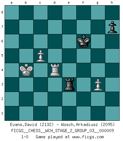 Last move : 1-0 2012 April 16 8:12:46 [Event "FICGS__CHESS__WCH_STAGE_2_GROUP_03__000009"] [Site "FICGS"] [Date "2012.01.12"] [Round "1"] [White "Evans,David"] [Black "Wosch,Arkadiusz"] [Result "1-0"] [WhiteElo "2132"] [BlackElo "2095"] 1.e4 c5 2.Nf3 Nc6 3.d4 cxd4 4.Nxd4 Nf6 5.Nc3 d6 6.Bg5 e6 7.Qd2 a6 8.O-O-O Bd7 9.f4 b5 10.a3 Be7 11.Nb3 b4 12.axb4 Nxb4 13.Be2 a5 14.Bxf6 gxf6 15.Nd4 Qb6 16.Kb1 a4 17.f5 a3 18.Ncb5 Na6 19.Nxa3 Nc5 20.fxe6 fxe6 21.Bh5+ Kd8 22.Qe3 Qb4 23.c4 e5 24.Ndc2 Qa4 25.b4 Rb8 26.Ka2 Ne6 27.Rd5 Nd4 28.Nxd4 exd4 29.Qxd4 Rg8 30.g3 Rxb4 31.Qc3 Bg4 32.Bxg4 Rxg4 33.Re1 Rg5 34.Rb1 Rxb1 35.Kxb1 Re5 36.Qd3 Qa7 37.Kb2 Qf2+ 38.Kb3 Ke8 39.Nb5 Qxh2 40.Nxd6+ Bxd6 41.Rxd6 Qf2 42.Rd8+ Kf7 43.Rd5 Re7 44.e5 Kg7 45.exf6+ Kxf6 46.Rd6+ Kg7 47.Qd4+ Qxd4 48.Rxd4 Re3+ 49.Kb4 Kf6 50.c5 1-0 Sicilian defense Queenside Castling by player White (move 8) 10 pieces endgame at move 45 : White KQRPPP , Black KQRP WHITE : King + 1 Queen 1 Rook 3 Pawns BLACK : King + 1 Queen 1 Rook 1 Pawn 9 pieces endgame at move 45 : White KQRPP , Black KQRP WHITE : King + 1 Queen 1 Rook 2 Pawns BLACK : King + 1 Queen 1 Rook 1 Pawn 8 pieces endgame at move 47 : White KRPP , Black KQRP WHITE : King + 1 Rook 2 Pawns BLACK : King + 1 Queen 1 Rook 1 Pawn 7 pieces endgame at move 48 : White KRPP , Black KRP WHITE : King + 1 Rook 2 Pawns BLACK : King + 1 Rook 1 Pawn Player White won this chess game. Follow this game move after move (download)Morphy was probably the greatest genius of them all. (Bobby Fischer) Es ist im Leben wie im Schachspiel. Wir entwerfen einen Plan, dieser bleibt jedoch bedingt durch das, was im Schachspiel dem Gegner, im Leben dem Schicksal zu tun belieben wird. (Arthur Schopenhauer) Me dio la sensación de como si yo estuviera jugando en contra del mismo Ajedrez. - al estar jugando en contra de Robert Fischer (Walter Shipman) Avec des compensations pour le matériel en plus... (Anonyme) No, I am still playing. (Anatoly Karpov)