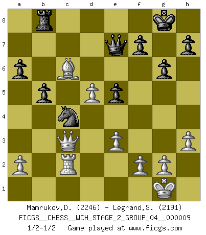 Last move : 1/2-1/2 2012 April 3 15:45:39 [Event "FICGS__CHESS__WCH_STAGE_2_GROUP_04__000009"] [Site "FICGS"] [Date "2012.01.12"] [Round "1"] [White "Mamrukov,Dmitri"] [Black "Legrand,Stephane"] [Result "1/2-1/2"] [WhiteElo "2246"] [BlackElo "2191"] 1.d4 Nf6 2.c4 g6 3.Nc3 d5 4.Nf3 Bg7 5.Bg5 Ne4 6.Bh4 Nxc3 7.bxc3 dxc4 8.Qa4+ Qd7 9.Qxc4 b6 10.e3 O-O 11.Qb3 Bb7 12.Bb5 Qg4 13.Be2 Nc6 14.h3 Qe4 15.O-O Na5 16.Qa3 c5 17.Rad1 Rfc8 18.Bd3 Qc6 19.Rfe1 cxd4 20.cxd4 e6 21.Bg3 Bf8 22.Qb2 Qa4 23.Qe2 Rc3 24.Ng5 Rac8 25.Ne4 Bxe4 26.Bxe4 Nc4 27.Bb7 Rd8 28.d5 e5 29.Rc1 Qa3 30.Rxc3 Qxc3 31.Bh4 Rb8 32.Bc6 b5 33.Rb1 a6 34.Qd1 Kg7 35.Rc1 Qa3 36.Rc2 Be7 37.Bxe7 Qxe7 38.Qa1 Kg8 39.Qc3 1/2-1/2 King's Indian defense, 3.Nc3 Kingside Castling by player Black (move 10) Kingside Castling by player White (move 15) This chess game ended in a draw. Follow this game move after move (download)I don't believe in psychology. I believe in good moves. (Bobby Fischer) Ich suche im Schach immer etwas Eigenes. Riskantes Spiel im Stile schachlicher Musketiere ist nicht meine Sache, auch wenn es vielen Freunden scharfer Wendungen gefällt. (Anatoly Karpov) Antes de los Finales, los dioses han colocado el Juego Medio. (Siegbert Tarrasch) Donnez-moi un Cavalier en 6e et je gagnerais toutes mes parties. (Steinitz) A generalist learns less and less about more and more until he knows nothing about everything. (Author unknown)