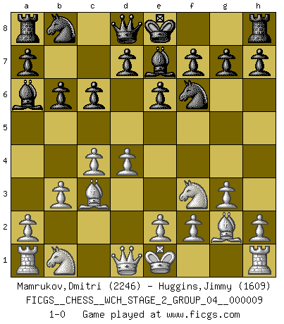 Last move : 1-0 2012 March 23 6:3:49 [Event "FICGS__CHESS__WCH_STAGE_2_GROUP_04__000009"] [Site "FICGS"] [Date "2012.01.12"] [Round "1"] [White "Mamrukov,Dmitri"] [Black "Huggins,Jimmy"] [Result "1-0"] [WhiteElo "2246"] [BlackElo "1609"] 1.d4 Nf6 2.c4 e6 3.Nf3 b6 4.g3 Ba6 5.b3 Bb4+ 6.Bd2 Be7 7.Bg2 c6 8.Bc3 1-0 Queen's Indian : Nimzovich variation (exaggerated Fianchetto) Player White won this chess game. Follow this game move after move (download)Chess, like love, is infectious at any age. (Flohr) Vielleicht wirkt die Aura früherer Spieler glanzvoller als die der heutigen Spieler, aber das liegt daran, dass man kein Programm wie Fritz hatte, das einem all die Löcher in ihren Partien zeigt. (Vladimir Kramnik) El Ajedrez es despiadado: debes de estar preparado para matar gente. (Nigel Short) Les échecs sont plus proches de l'art de l'assassinat que de l'art de la guerre. (Arturo Perez-Reverte) I live to kill Traxler counterattack. (Ilmars Cirulis)