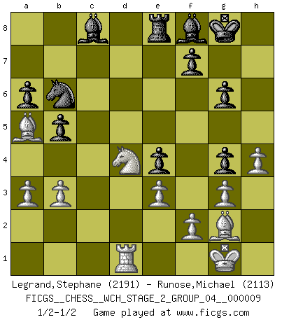 Last move : 1/2-1/2 2012 March 21 1:4:20 [Event "FICGS__CHESS__WCH_STAGE_2_GROUP_04__000009"] [Site "FICGS"] [Date "2012.01.12"] [Round "1"] [White "Legrand,Stephane"] [Black "Runose,Michael"] [Result "1/2-1/2"] [WhiteElo "2191"] [BlackElo "2113"] 1.Nf3 Nf6 2.g3 d5 3.d4 c5 4.Bg2 cxd4 5.O-O h6 6.b3 e6 7.Bb2 Bc5 8.Nxd4 O-O 9.c4 e5 10.Nf3 e4 11.Nd4 Re8 12.cxd5 Qxd5 13.Nc2 Qg5 14.Qd2 Nc6 15.Qxg5 hxg5 16.Nc3 Nd4 17.Rac1 Be6 18.Kh1 Nxc2 19.Rxc2 Bf8 20.Rfc1 Bd7 21.e3 Rad8 22.Bf1 Rc8 23.Kg1 a6 24.h3 Rc6 25.Ne2 Nd5 26.Rxc6 Bxc6 27.Nd4 Bd7 28.a3 g6 29.Bg2 b5 30.Rd1 Nb6 31.Bc3 g4 32.h4 Bc8 33.Ba5 1/2-1/2 Reti Opening Kingside Castling by player White (move 5) Kingside Castling by player Black (move 8) This chess game ended in a draw. Follow this game move after move (download)Even the laziest King flees wildly in the face of a double check ! (Aaron Nimzowitsch) Fischer machte Schach einfach zu einer aufregenden Sache, wann immer er sich ans Brett setzte. (Raymond Keene) Uno no tiene que jugar muy bien, es suficiente jugar mejor que el oponente. (Siegbert Tarrasch) Je ne suis pas le dernier à jouer lâchement des coups douteux pendant le zeïtnot de l'adversaire pour l'achever: en effet les coups qui font le plus peur sont ceux que l'on ne comprend pas. Je me fais souvent peur quand je joue. (Un professeur anonyme) Every now and then a man's mind is stretched by a new idea and never shrinks back to its former dimensions. (Oliver Wendell Holmes, Sr.)