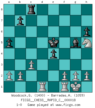 Last move : 1-0 2007 January 23 13:22:17 [Event "FICGS__CHESS__RAPID_C__000018"] [Site "FICGS"] [Date "2007.01.15"] [Round "1"] [White "Woodcock,Graham"] [Black "Barradas,Anderson"] [Result "1-0"] [WhiteElo "1400"] [BlackElo "1059"] 1.e4 c5 2.d4 cxd4 3.Qxd4 Nc6 4.Qe3 e5 5.Bc4 Nf6 6.Nf3 d6 7.Ng5 h6 8.Nxf7 Qa5+ 9.Bd2 Qc7 10.Nxh8 Nd4 11.Qc3 Nxe4 12.Bf7+ Kd8 13.Qxc7+ Kxc7 14.Na3 Bf5 15.Be3 Be7 16.Ng6 Bg5 17.Bxd4 exd4 18.Nb5+ Kb6 19.Nxd4 Bxg6 20.Bxg6 d5 21.Bxe4 dxe4 22.O-O Rc8 23.c3 Kc5 24.Ne6+ Kd5 25.Nxg7 a5 26.Rad1+ Ke5 27.Nh5 1-0 Sicilian : Smith-Morra gambit Kingside Castling by player White (move 22) Player White won this chess game. Follow this game move after move (download)The game of Chess is not merely an idle amusement; several very valuable qualities of the mind are to be acquired and strengthened by it, so as to become habits ready on all occasions; for life is a kind of Chess. (Benjamin Franklin) Obendrein hat der FIDE-Präsident den Revolutionsführer Gaddafi zum »Großmeister« ernannt, am Ende der WM. Das ist lächerlich! (Joel Lautier) La belleza de un movimiento no se refleja solo en su apariencia, sino en el pensamiento detrás de él. (Siegbert Tarrasch) Psychologiquement, tu dois avoir confiance en toi même, mais cette confiance doit être basée sur des faits. (Robert Fischer) The intuitive mind is a sacred gift; the rational mind is a faithful servant. We have created a society that honors the servant but has forgotten the gift. (Albert Einstein)