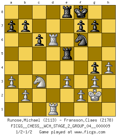 Last move : 1/2-1/2 2012 March 9 10:41:10 [Event "FICGS__CHESS__WCH_STAGE_2_GROUP_04__000009"] [Site "FICGS"] [Date "2012.01.12"] [Round "1"] [White "Runose,Michael"] [Black "Fransson,Claes"] [Result "1/2-1/2"] [WhiteElo "2113"] [BlackElo "2178"] 1.d4 Nf6 2.c4 e6 3.Nf3 Bb4+ 4.Bd2 Qe7 5.g3 Bxd2+ 6.Qxd2 Nc6 7.a3 d5 8.Bg2 O-O 9.O-O dxc4 10.Qc3 e5 11.dxe5 Ng4 12.Qxc4 Ncxe5 13.Nxe5 Qxe5 14.Nc3 c6 15.Rfd1 Re8 16.Qd4 Qh5 17.h4 Nf6 18.Bf3 Qf5 19.Qb4 Qe5 20.Na4 h5 21.Rac1 Rb8 22.Qc5 Bg4 23.Qxe5 Rxe5 24.Bxg4 hxg4 25.e3 Ne4 26.Nc3 Nf6 27.Rd6 Rbe8 28.Rcd1 Kf8 29.Kg2 1/2-1/2 Bogo-Indian defense, Nimzovich variation Kingside Castling by player Black (move 8) Kingside Castling by player White (move 9) This chess game ended in a draw. Follow this game move after move (download)By playing at Chess then, we may learn: First: Foresight... Second: Circumspection... Third: Caution... And lastly, we learn by Chess the habit of not being discouraged by present bad appearances in the state of our affairs, the habit of hoping for a favorable chance, and that of persevering in the secrets of resources. (Benjamin Franklin) Ein Teil des Fehlers ist immer korrekt. (Savielly Grigorievitsch Tartakower) Si el Ajedrez es una ciencia, es la mas inexacta. Si el Ajedrez es un arte, es demasiado inexacto para ser visto como tal. Si el Ajedrez es un deporte, es demasiado esotérico. Si el Ajedrez es un juego, es demasiado exigente para ser solo un juego. Si el Ajedrez es una aventura, es una muy demandante. Si el Ajedrez es una pasión, es una muy gratificante. Si el Ajedrez es la vida, es una muy triste. (Anónimo) Shah mat. Le roi est mort. Cri de fierté d'un joueur venant de terrasser son adversaire, courtoisement, sans effusion de sang. Knowledge rests not upon truth alone, but upon error also. (Carl G. Jung)