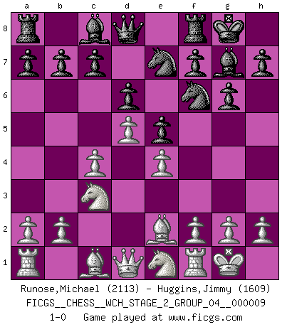 Last move : 1-0 2012 March 23 6:4:36 [Event "FICGS__CHESS__WCH_STAGE_2_GROUP_04__000009"] [Site "FICGS"] [Date "2012.01.12"] [Round "1"] [White "Runose,Michael"] [Black "Huggins,Jimmy"] [Result "1-0"] [WhiteElo "2113"] [BlackElo "1609"] 1.d4 Nf6 2.c4 g6 3.Nc3 Bg7 4.e4 d6 5.Nf3 O-O 6.Be2 e5 7.O-O Nc6 8.d5 Ne7 9.Ne1 1-0 King's Indian : Orthodox, Aronin-Taimanov variation (Yugoslav attack / Mar del Plata variation) Kingside Castling by player Black (move 5) Kingside Castling by player White (move 7) Player White won this chess game. Follow this game move after move (download)Chess is no whit inferior to the violin, and we have a large number of professional violinists. (Mikhail Botvinnik) Wie bekannt hörte Morphy 1859 auf, Schach zu spielen. Seine Enttäuschung galt nicht so sehr dem Schach, wie den Schachspielern. (Robert James Fischer) ¿Porque tengo que perder ante este idiota?. (Aron Nimzovich) On peut tirer plus d'utilité d'une partie perdue que de 100 parties gagnées. (Capablanca) Humor is by far the most significant activity of the human brain. (Edward De Bono)