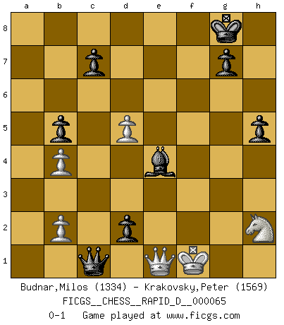Last move : 0-1 2012 April 6 7:44:9 [Event "FICGS__CHESS__RAPID_D__000065"] [Site "FICGS"] [Date "2012.01.13"] [Round "1"] [White "Budnar,Milos"] [Black "Krakovsky,Peter"] [Result "0-1"] [WhiteElo "1334"] [BlackElo "1569"] 1.e4 e5 2.Nf3 Nc6 3.Bb5 a6 4.Ba4 Nf6 5.O-O Be7 6.Nc3 b5 7.Bb3 d6 8.Nd5 Na5 9.Nxe7 Qxe7 10.d3 O-O 11.Re1 h6 12.Bd2 Nxb3 13.axb3 Nh7 14.c4 Bg4 15.h3 Bh5 16.g4 Bg6 17.cxb5 axb5 18.Rxa8 Rxa8 19.b4 h5 20.g5 f6 21.h4 Rf8 22.Nh2 fxg5 23.hxg5 Nxg5 24.Bxg5 Qxg5+ 25.Kh1 Rxf2 26.Rg1 Qf4 27.Rg2 Rxg2 28.Kxg2 d5 29.exd5 e4 30.Qe2 exd3 31.Qf2 Be4+ 32.Kg1 Qg5+ 33.Kf1 Qc1+ 34.Qe1 d2 0-1 Ruy Lopez : Closed defense Kingside Castling by player White (move 5) Kingside Castling by player Black (move 10) Player Black won this chess game. Follow this game move after move (download)Some sacrifices are sound; the rest are mine. (Mikhail Tal) Strategie ist, wie man ein Mädchen auf den Rücksitz bekommt. Taktik ist, was man tut, wenn man dann dort ist. (Anonymous) La belleza de un movimiento no se refleja solo en su apariencia, sino en el pensamiento detrás de él. (Siegbert Tarrasch) Un journaliste : 'Vous préférez avoir une dame de plus sur l'échiquier ou au lit ?' Boris Spassky : 'Ca dépend de la position.' If only people were all showed a certain minimum level of niceness; if only people didn't retract verbal draw offers (without draw box ticked) on ficgs; if only people didn't kill; if only people didn't run concentration / extermination camps, if only people didn't drop nuclear bombs on Hiroshima and Nagasaki, and so on - it would be a much more beautiful world. But sadly, things are not so... (Normajean Yates)