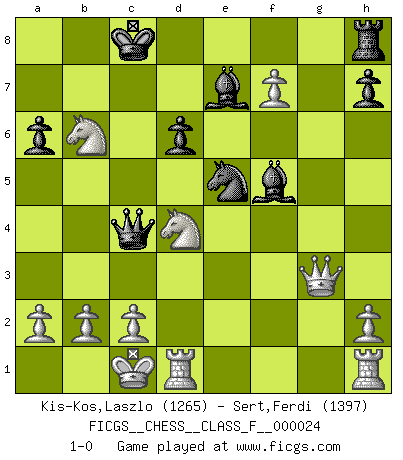 Last move : 1-0 2007 January 23 8:50:56 [Event "FICGS__CHESS__CLASS_F__000024"] [Site "FICGS"] [Date "2007.01.15"] [Round "1"] [White "Kis-Kos,Laszlo"] [Black "Sert,Ferdi"] [Result "1-0"] [WhiteElo "1265"] [BlackElo "1397"] 1.e4 c5 2.Nf3 d6 3.d4 cxd4 4.Nxd4 Nf6 5.Nc3 a6 6.Bg5 e6 7.f4 Be7 8.Qf3 Qc7 9.O-O-O Nbd7 10.g4 b6 11.Bxf6 gxf6 12.f5 Ne5 13.Qg3 Bd7 14.Nce2 O-O-O 15.Nf4 Rdg8 16.fxe6 Bc6 17.exf7 Rxg4 18.Bh3 f5 19.Bxg4 Bxe4 20.Bxf5+ Bxf5 21.Nd5 Qc4 22.Nxb6+ 1-0 Sicilian : Najdorf, 7...Be7 Queenside Castling by player White (move 9) Queenside Castling by player Black (move 14) Player White won this chess game. Follow this game move after move (download)A great player and a great example for many. His book My 60 Memorable Games had a big impact on me. It is a shame he didn't continue to enrich the world of chess with his unparalleled understanding after 1972. (Jan Timman, about Bobby Fischer's death) Nach Morphy wurde nichts neues mehr in der Behandlung offener Positionen gefunden. (Mikhail Moiseyevich Botvinik) Las combinaciones han sido siempre el aspecto más intrigante del Ajedrez. Los Maestros las buscan, el público las aplauden, los críticos las alaban. La razón se debe a que las combinaciones hacen posible que el Ajedrez sea más que un ejercicio matemático con una carencia de vida. Ellas son la poesía del juego, son del Ajedrez lo que la melodía es de la música. Ellas representan el triunfo de la mente sobre la materia. (Reuben Fine) A chaque perte on perd un peu de soi. (Joël Lautier) A computer lets you make more mistakes faster than any invention in human history - with the possible exceptions of handguns and tequila. (Mitch Ratcliffe)