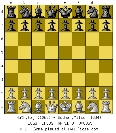 Last move : 0-1 2012 February 12 19:22:12 [Event "FICGS__CHESS__RAPID_D__000065"] [Site "FICGS"] [Date "2012.01.13"] [Round "1"] [White "Nath,Raj"] [Black "Budnar,Milos"] [Result "0-1"] [WhiteElo "1066"] [BlackElo "1334"] 0-1 This chess game has been lost on time (started : 2012.01.13 14:56:30) Player Black won this chess game. Follow this game move after move (download)One bad move nullifies forty good ones. (Horowitz) Kein Schachspieler kann gut schlafen. (H. G. Wells) Cada Peón es una Reina en potencia. (James Mason) Les échecs, c'est la lutte contre l'erreur. (Johannes Zukertort) Shallow men believe in luck. Strong men belive in cause and effect. (Ralph Waldo Emerson)